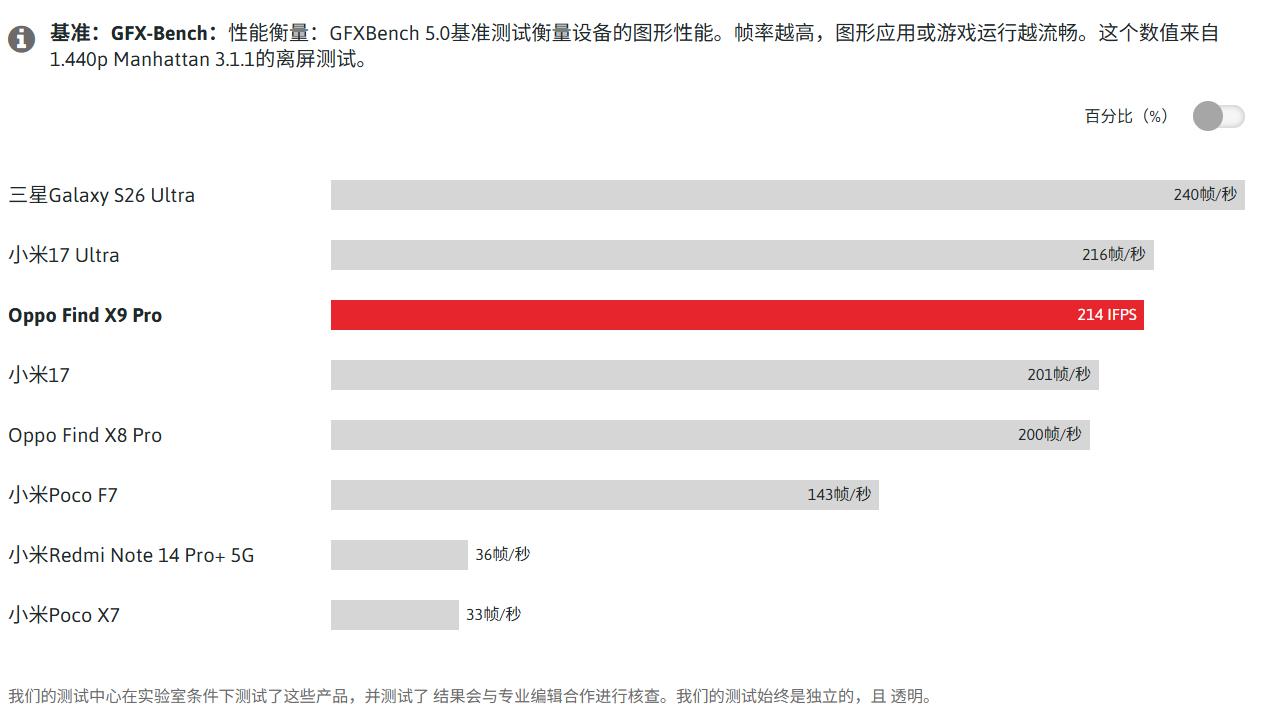 OPPO Find X9 Pro搭载了联发科天玑9500处理器。这款芯片与高通骁龙旗舰芯片形成了有力竞争,在性能表现上相当卓越。它具备充沛的应用运行性能,其图形处理能力甚至足以应对要求较高的手机游戏。在基准测试中,我们测得其帧率高达214帧/秒,这一成绩使得OPPO Find X9 Pro跻身顶级智能手机的行列。