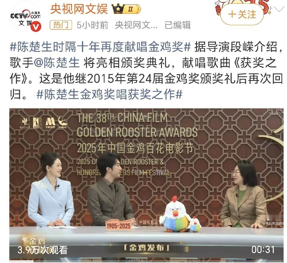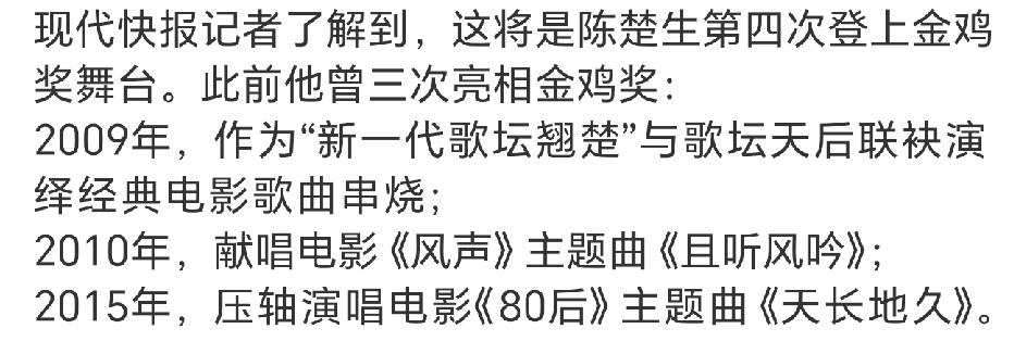 陈楚生要参加金鸡奖颁奖典礼献唱《获奖之作》,这是他第四次登上金鸡奖颁奖典礼,前三
