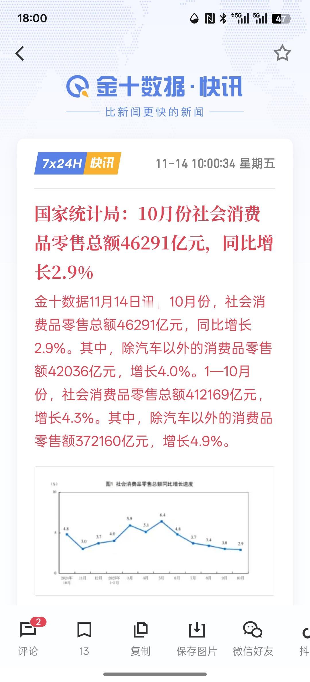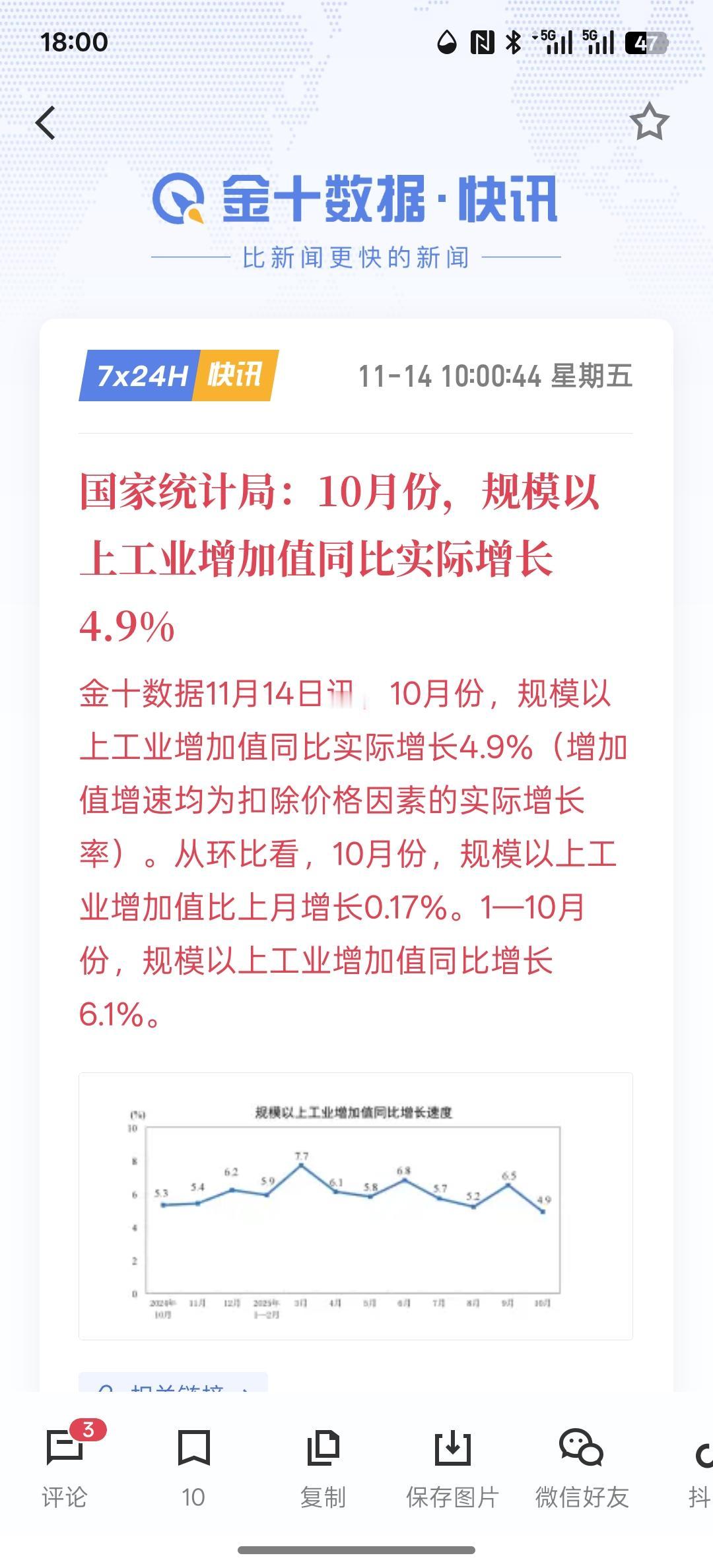国家统计局:10月份,规模以上工业增加值同比实际增长4.9%。按照10月份的经济