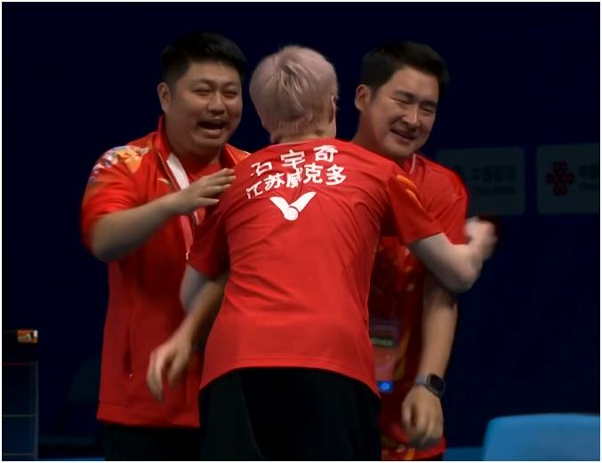 羽毛球男团决赛,江苏队石宇奇险胜浙江队孙超,21:16、17:21、25:23。