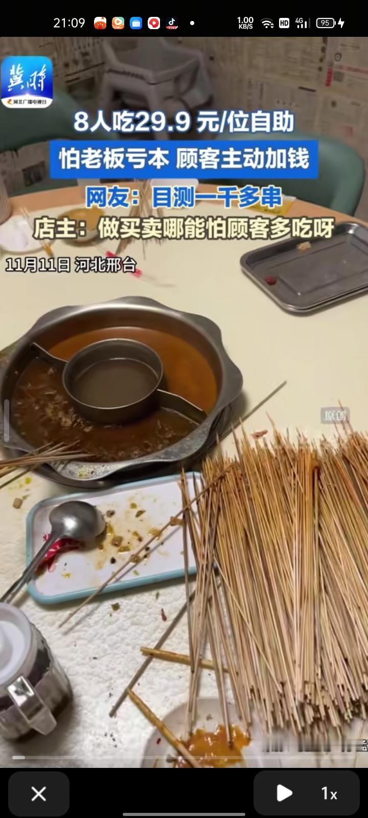 11月8日,河北邢台。八人吃29.9元/位的串串香自助,怕老板亏本,结账时有人主动加钱。店老板孟先生表示,开门做生意哪能怕顾客吃得多,就跟顾客说“吃得少我也没少收,不用加钱了”,征得几位大哥同意后,就拍了这个视频。