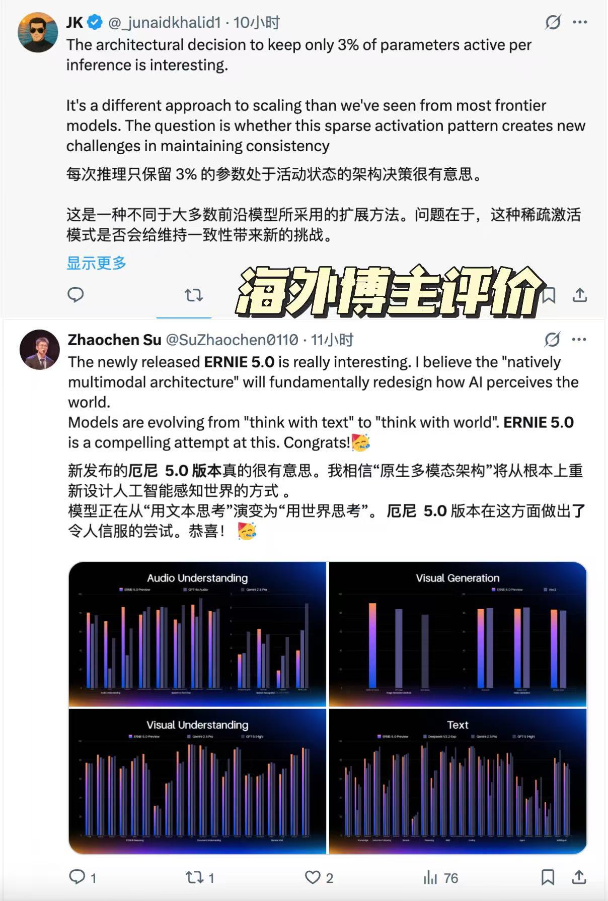 文心5.0凭什么让海外博主集体点赞?当百度在海外直播介绍文心5.0的时候,一个技术名词突然在X平台火了起来,Natively Omni-modal Modeling,翻译过来就是原生全模态。这个看起来有点拗口的概念,却让不少海外科技博主眼前一亮。有人直接评论说,这可能是大模型接下来发展的清晰方向。话说得这么绝对,到底什么来头?说白了就是一个核心差异,业界大多数多模态模型都是后期拼凑出来的。先训练文本模型,再训练图像模型,最后想办法把它们缝合在一起。就像搭积木,每块积木本来就是独立的,你硬要把它们搭成一个城堡。文心5.0不一样,它从训练的第一天开始,就把语言、图像、视频、音频这些数据混在一起喂给模型。模型从出生那刻起,就知道这个世界本来就是多模态的,不是只有文字或只有图片。这种训练方式带来的变化是根本性的。传统的多模态模型处理问题时,更像是在不同专家之间切换。你问它文字问题,它调用文本专家,你给它看图片,它切换到视觉专家。每个专家都很厉害,但协同起来总觉得差点意思。文心5.0的逻辑完全不同,它不是在不同模态之间来回切换,而是真正以一个统一的智能体在思考。你给它一段视频配一段文字描述,它能同时理解画面在说什么、文字在表达什么,以及两者之间的关系是什么。数据很能说明问题,文心5.0的模型参数量达到2.4万亿,在40多项权威基准测试中,它的语言和多模态理解能力已经可以和Gemini-2.5-Pro、GPT-5-High这些国际顶级模型持平。图像和视频生成能力,也达到了垂直领域专精模型的水平。为什么海外科技圈会对这个技术路线如此关注?因为多模态是目前AI领域公认的下一个突破口,但怎么做多模态,大家其实都在摸索。简单粗暴的后期融合方案虽然见效快,但天花板也很明显。模型越大、模态越多,这种拼凑式的方案就越力不从心。百度这次直接从源头解决问题,原生全模态意味着模型从一开始就被设计成多模态的,它的架构、训练方式、优化目标,全都是为多模态协同准备的。这种做法难度大、周期长、成本高,但一旦做成了,带来的提升是系统性的。文心5.0在多模态理解、指令遵循、创意写作、事实性、智能体规划这些方面的表现,都印证了这条路的潜力。更关键的是,这给整个行业指了一个方向。
