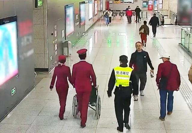 地铁工作人员与驻站民警一起护送乘客出站。通讯员供图