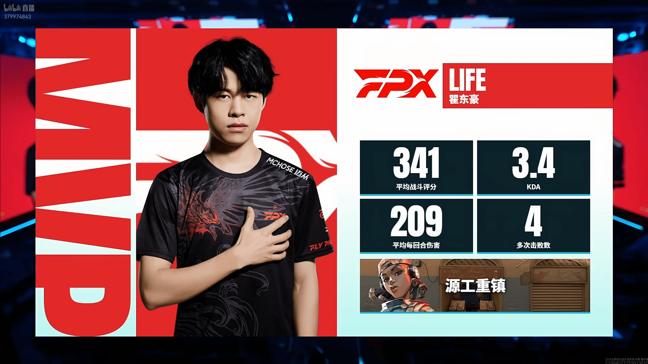 341战斗评分209回合均伤,Life斩获FPX对阵TE图三MVP