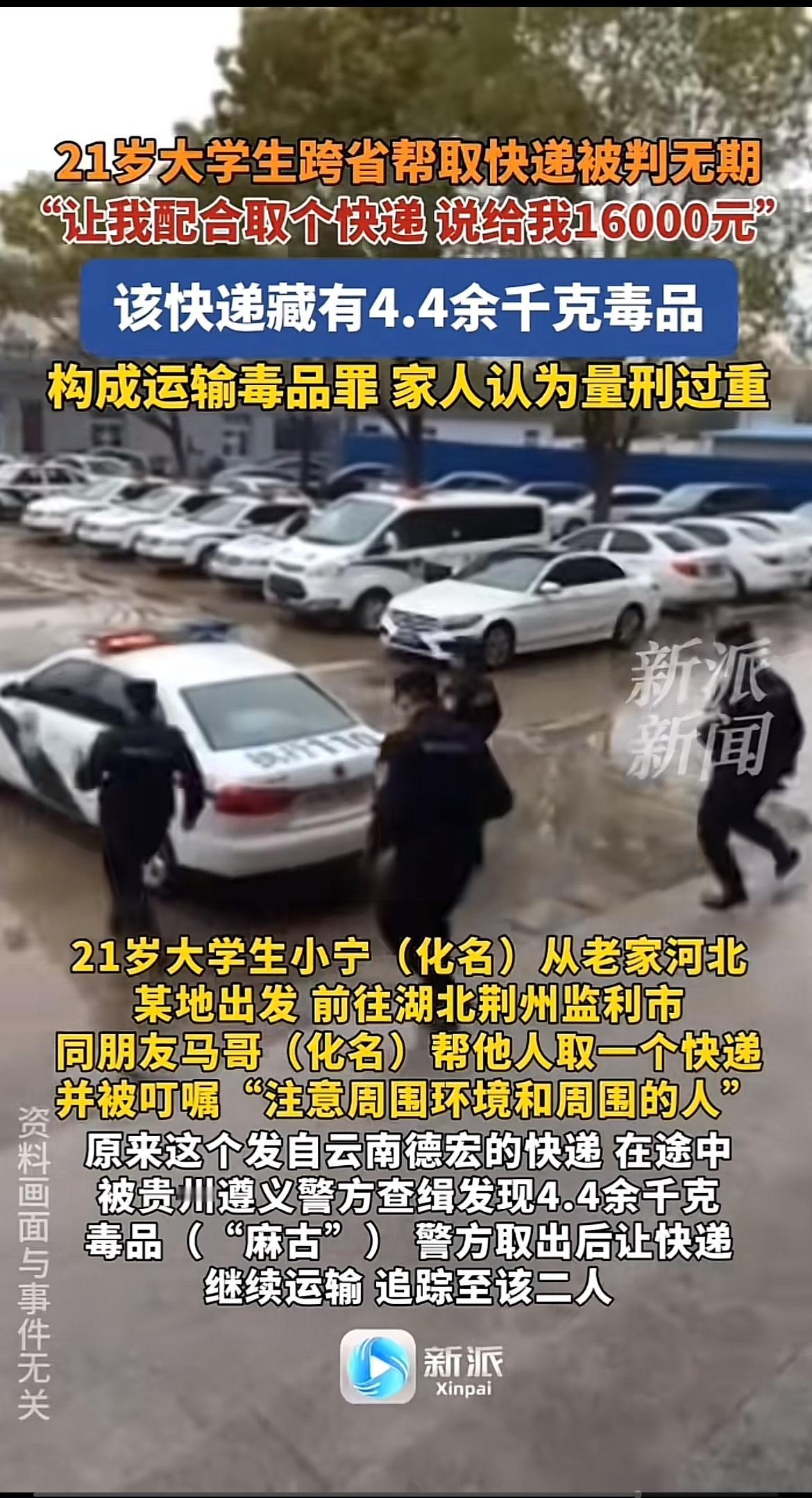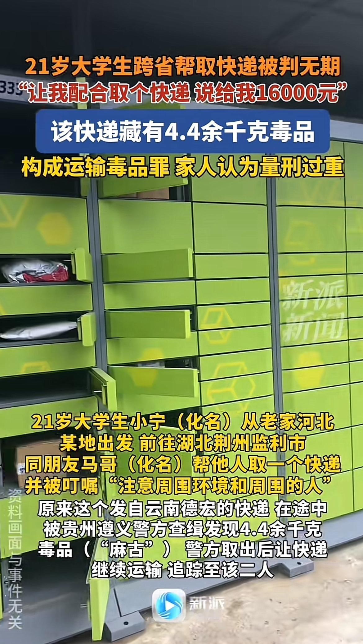 21岁大学生小宁帮人跨省取快递,结果被判无期徒刑,这事儿可太让人唏嘘了。2020年12月,他从河北跑到湖北取快递,和朋友马哥打车送件时被抓,快递里藏着4.4余千克“麻古”。历经多次审判,小宁和马哥分别获刑无期和死缓。 小宁家属觉得量刑过重,已向最高院申诉,理由是他家境优渥,没必要为钱冒险,且他不知快递有毒品。但法学专家说了,运输毒品罪在途中被查获也算既遂。这事儿也给咱提了个醒,遇到异常情况,可千万别存侥幸心理啊。