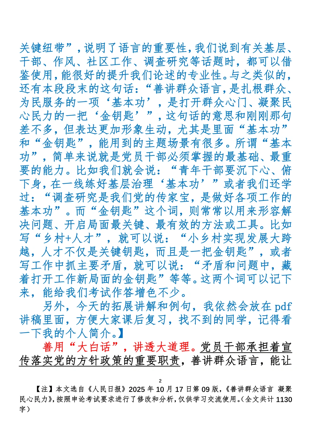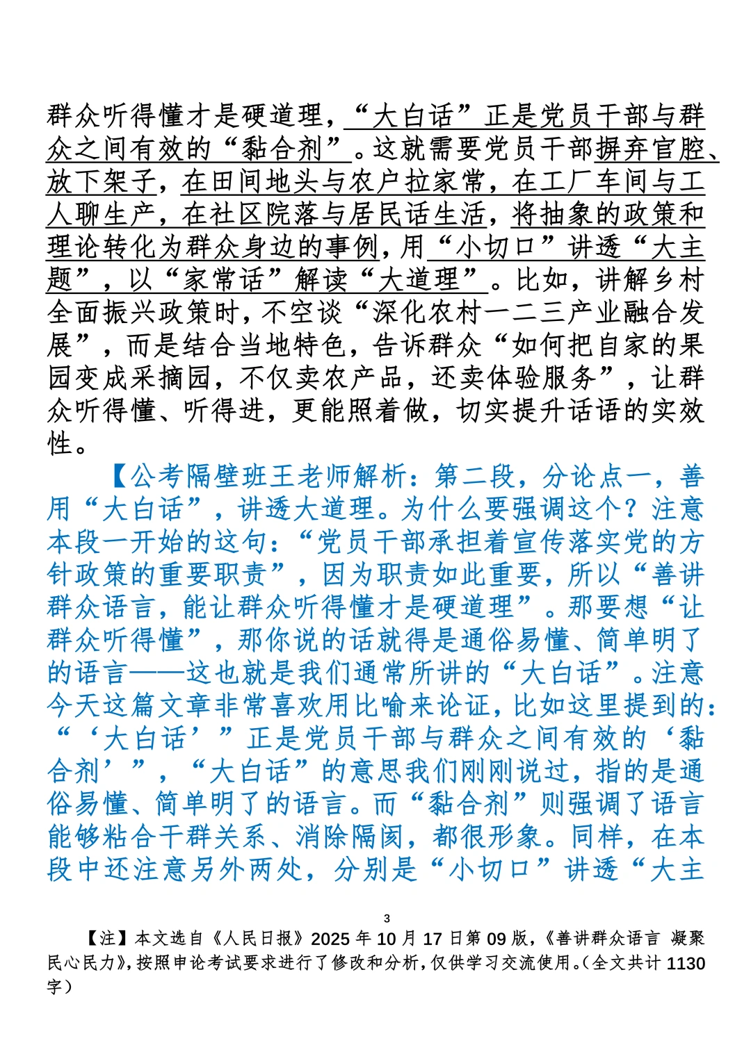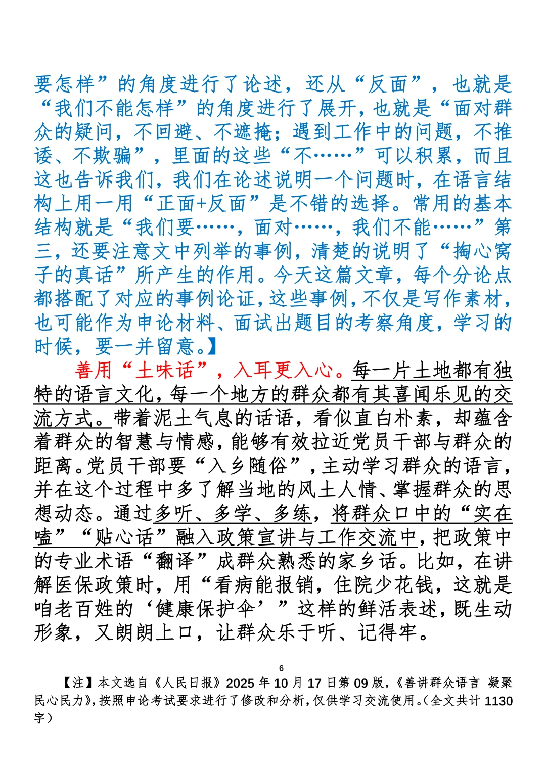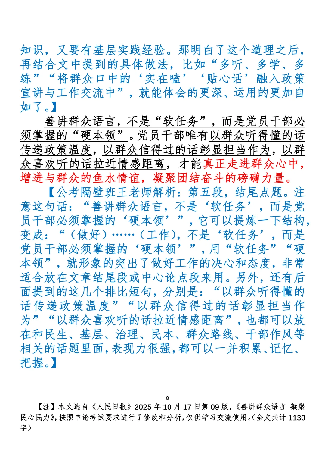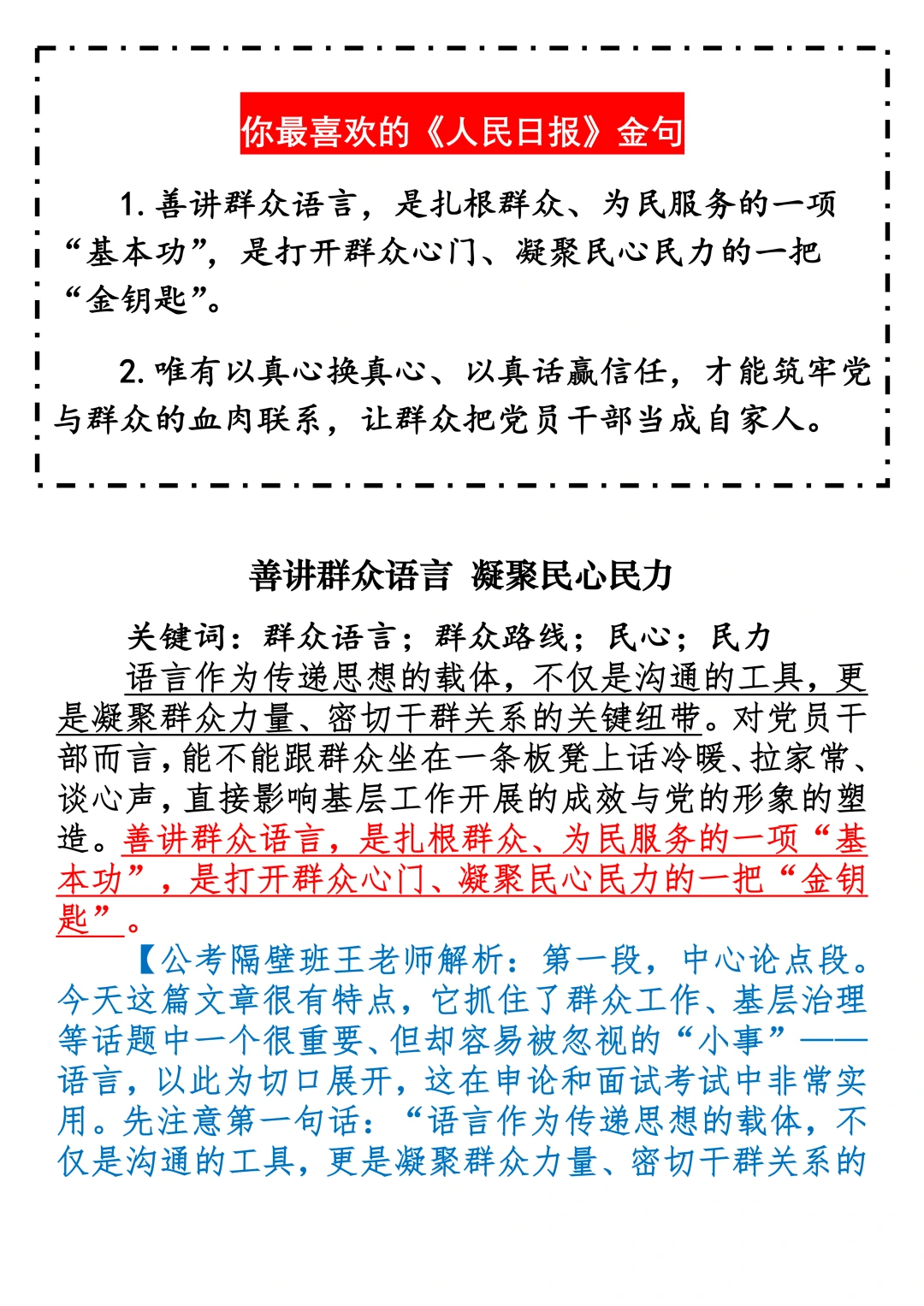 如何抄写:每日抄写文章发在“公考隔壁班王老师”账号,红色字是重点句和结构句,黑色字是正文,蓝色字是解析,大家抄写时不必抄蓝色字。建议先通读全文,做到心中有数再开始抄写,效果会更好。 关于文章:抄写文章来源于人民日报,但每篇文章我都根据申论考试要求进行了修改:一是重写或修改开头、结尾;二是统一段首句句式结构;三是调整段落字数,使文章结构更均衡;四是简化复杂长难句,使之更具可模仿性。每篇文章无论修改多少,都是基于申论考试要求,毫无对人民日报文章品评之意。(此处致敬人民日报)