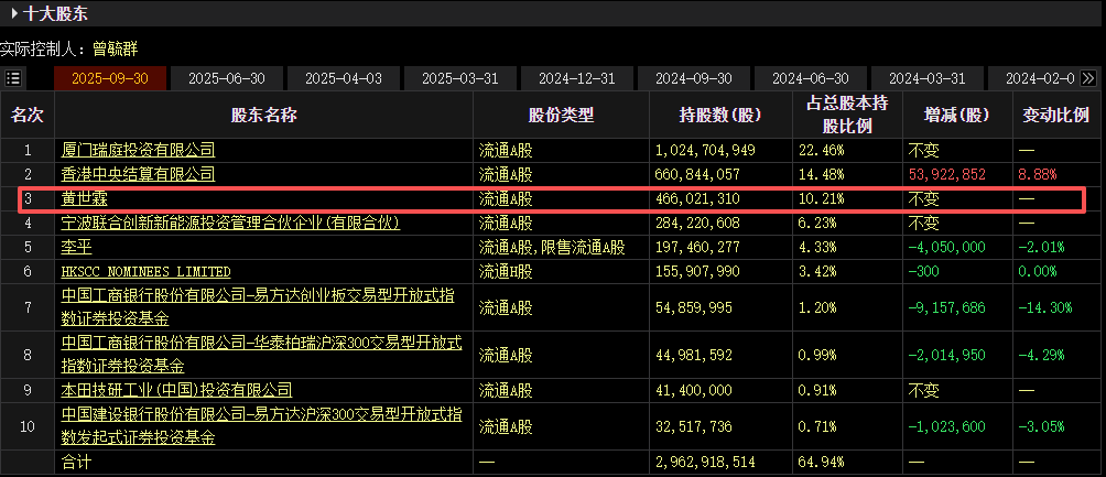 小财注:截至三季度末,黄世霖持有宁德时代10.21%股份,为公司的第三大股东。宁德时代今日收盘价为404.12元/股,以此计算,黄世霖转让的股份市值约184.41亿元。