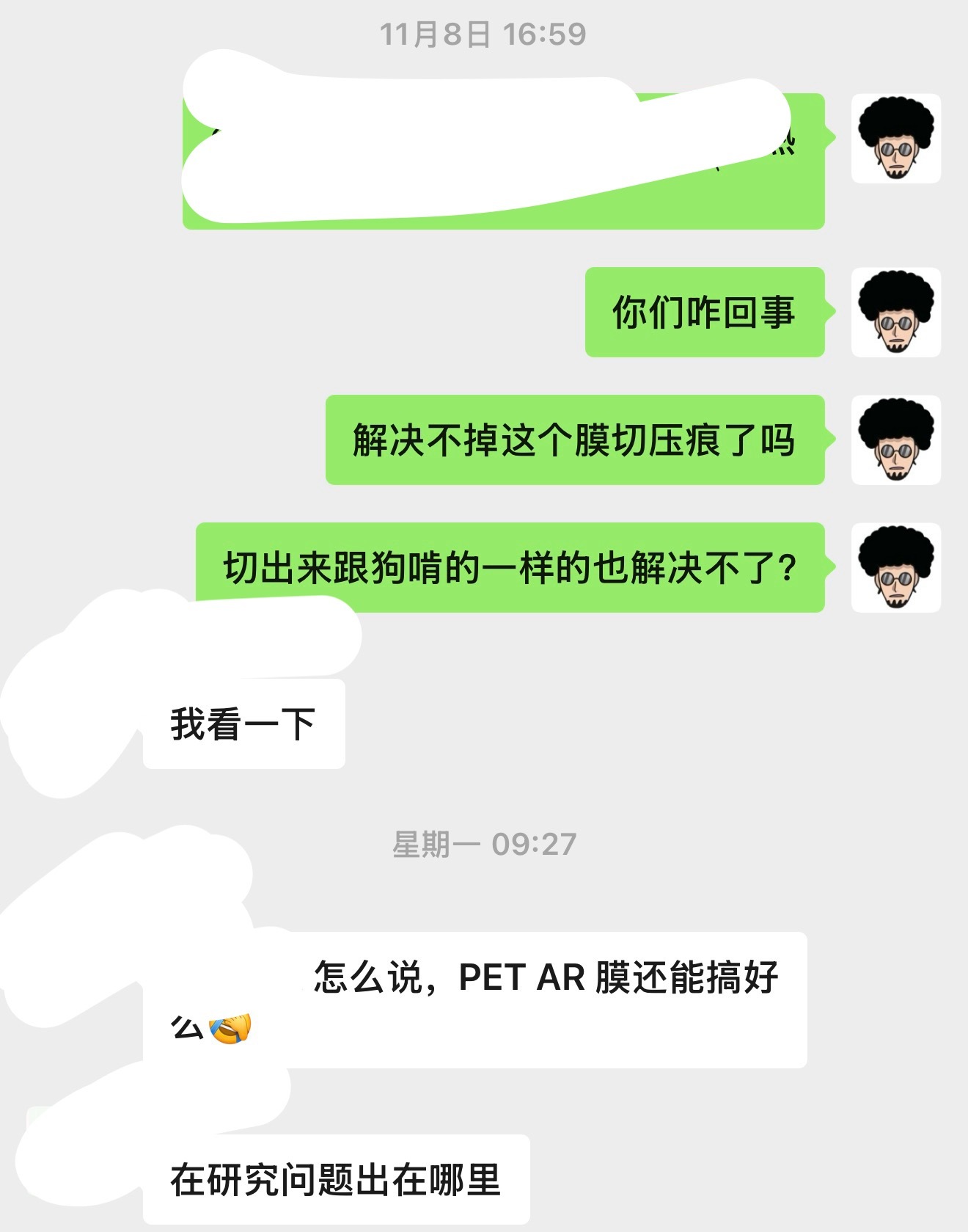 pet AR 膜做了一批货,翻车了,重新做,又翻车了。工厂还在想办法,我们也只能