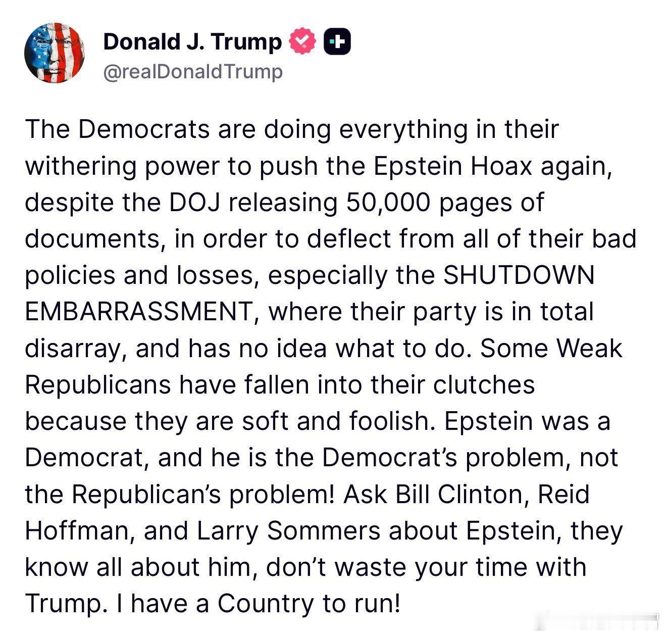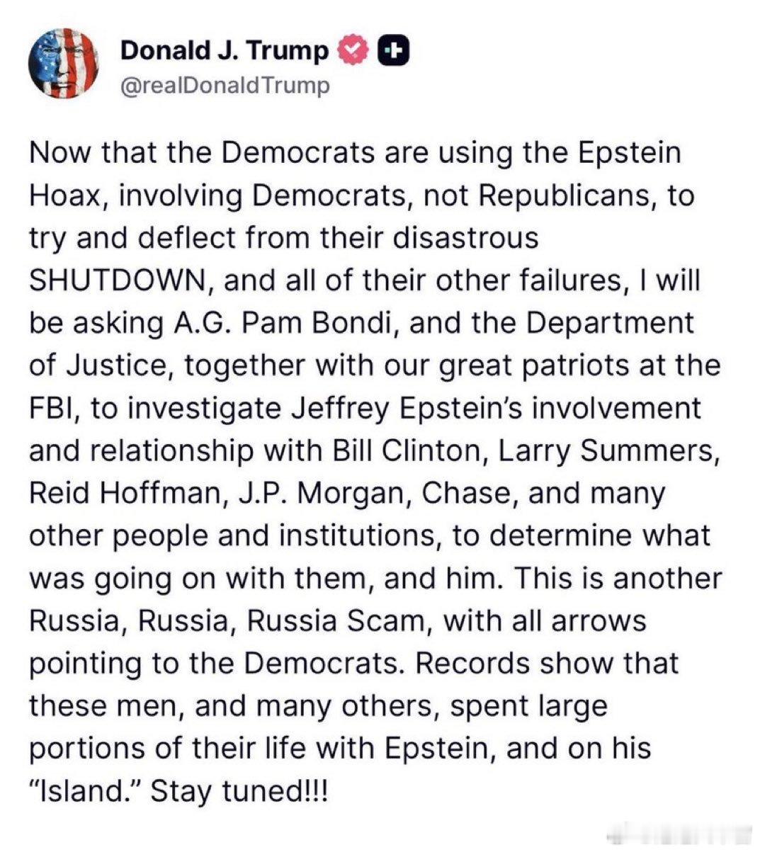 突发新闻:川普总统命令司法部和联邦调查局对杰弗里·爱泼斯坦涉嫌与比尔·克林顿、拉里·萨默斯、里德·霍夫曼、摩根大通等人的联系展开全面调查。为此他连发两贴。贴一:“民主党人需要开始询问比尔•克林顿、里德·霍夫曼和拉里·萨默斯有关爱泼斯坦的问题。爱泼斯坦是民主党人,他是民主党的问题,不是共和党的问题!去问问比尔·克林顿、里德·霍夫曼和拉里·萨默斯关于爱泼斯坦的事,他们对他了如指掌,别在我身上浪费时间。我还要治理国家呢!”贴二:“现在,民主党人利用涉及民主党人而非共和党人的“爱泼斯坦骗局”来转移人们对其灾难性的政府停摆以及其他所有失败的注意力。对此,我将要求司法部长帕姆·邦迪和司法部,以及我们伟大的联邦调查局同仁,共同调查杰弗里·爱泼斯坦与比尔·克林顿、拉里·萨默斯、里德·霍夫曼、摩根大通、大通银行以及其他众多人士和机构的牵连和关系,以查明他们之间以及爱泼斯坦与这些人之间究竟发生了什么。这又是一场“通俄门”骗局,所有矛头都指向民主党。记录显示,这些人以及其他许多人,都曾与爱泼斯坦共度人生的大部分时光,并在他的“岛屿”上生活。敬请关注!”你不仁就休怪我不义,老川曾想退一步息事宁人。但如果不明真相的民主党蠢货们还在跌跌不休地要公开爱泼斯坦档案,期望从中找到和川普总统有关的蛛丝马迹,那么他们肯定会失望的。因为常识告诉我们,连虚假通俄门,老妇强奸案,突袭麻辣宫,封口费和暗杀手段等各种下三滥手段都用上了,那么掌握在民主党手上多年的爱泼斯坦档案绝对是对川普绝缘的,否则老川早就完蛋了。看来民主党这次又要搬起石头砸自己的脚了。不明真相的蠢货们还帮主子挑了一块最大的石头。