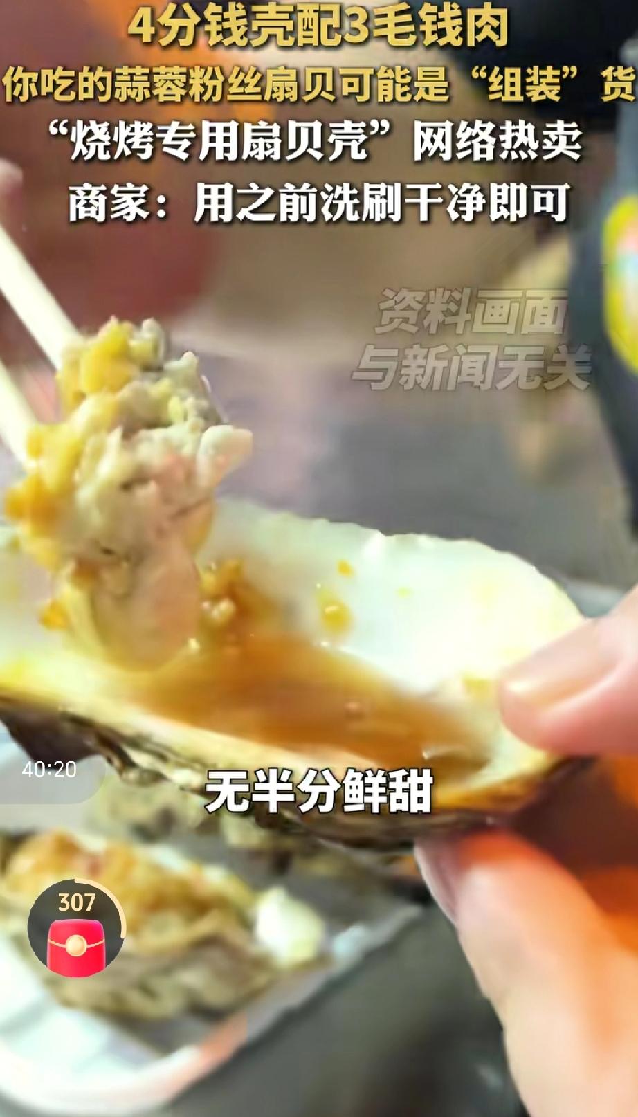 近期市面上热销的蒜蓉粉丝烤扇贝可能是“组装”货,由4分钱一个的扇贝壳和3毛钱的冻