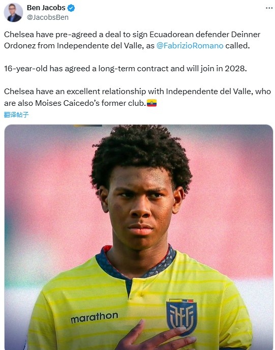 直播吧11月15日讯据记者BenJacobs报道,切尔西预签厄瓜多尔16岁天才后卫奥多涅斯(DeinnerOrdonez)达成协议,这名小将已经得到一份长期合同,他将于2028年1月正式加盟。