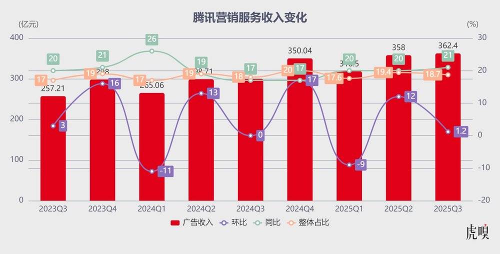受此驱动,2025Q3腾讯营销服务收入同比提升21%至362.4亿元,连续十二个季度保持两位数增速。