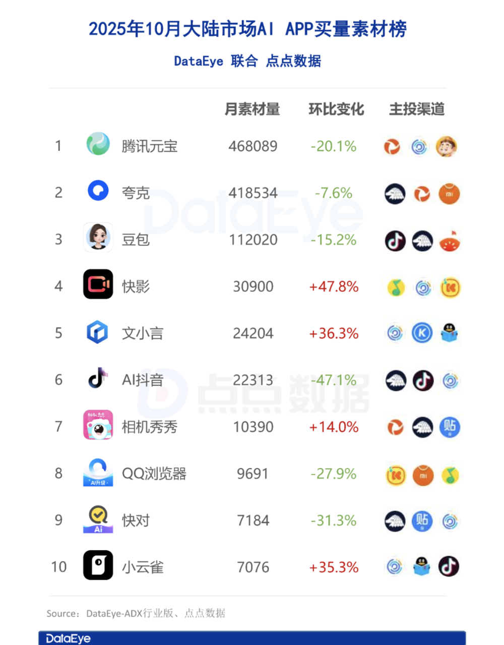不过,2025Q3腾讯销售及市场推广开支达115亿元,同比、环比均增加20亿元,财报披露主要用于推广AI原生应用程序及游戏;但从市场投放表现来看,其中很大一部分用在了元宝的推广投入上:DataEye数据显示,腾讯元宝在10月的AI产品买量位列中国大陆AI应用市场Top1,夸克与豆包紧随其后。