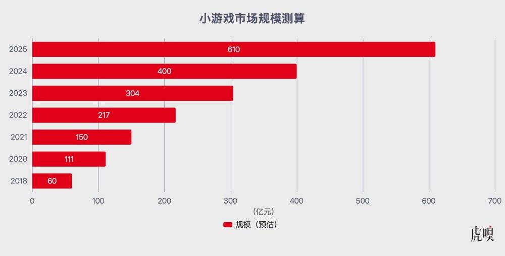 此外,一个隐秘风口在微信与抖音搅动下长出数百亿市场——DataEye研究院基于小程序游戏国内买量消耗、买量参投情况、备案新增产品情况,以及大厂内测产品布局情况综合判断,预计2025年小游戏市场规模或高达610亿,较七年前涨了10倍。