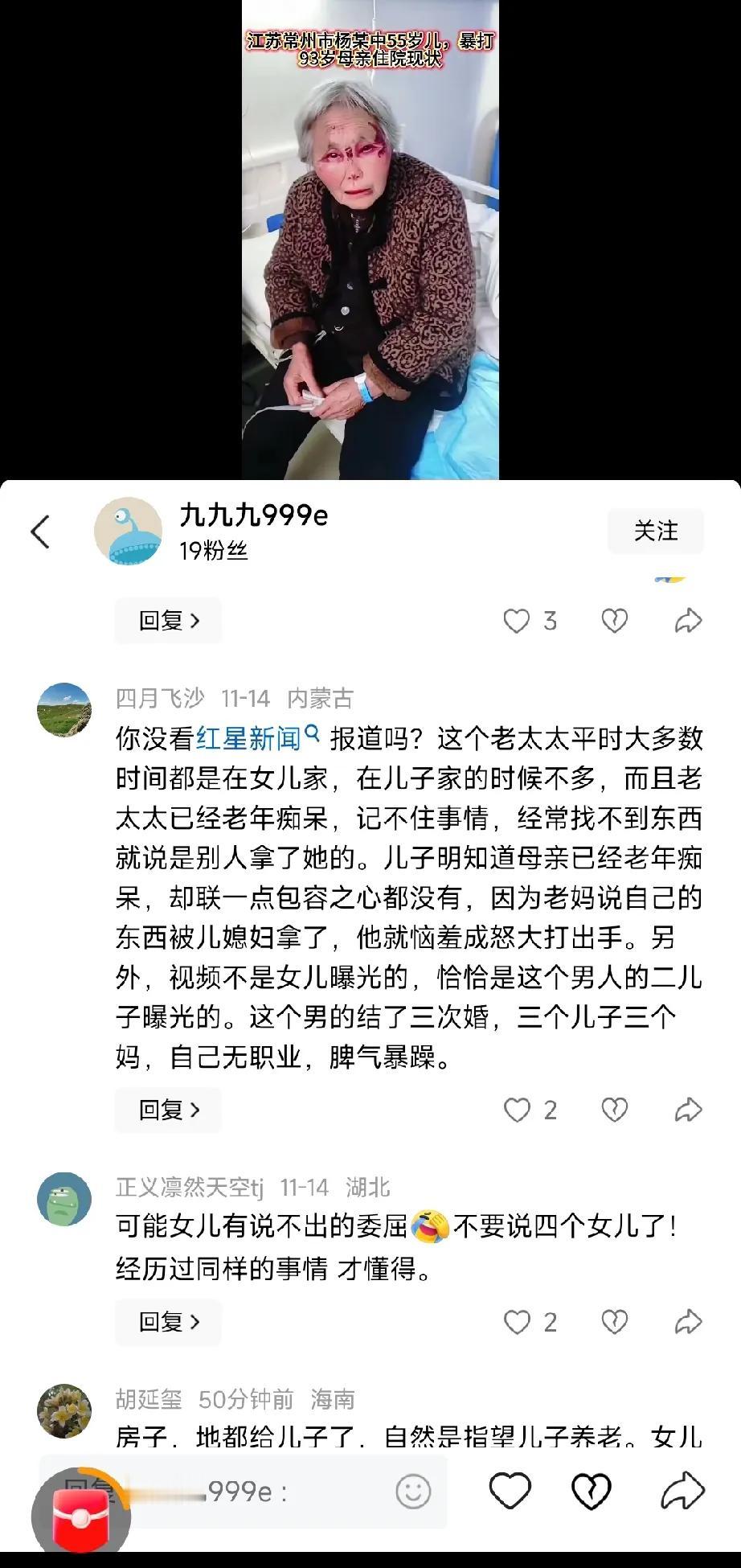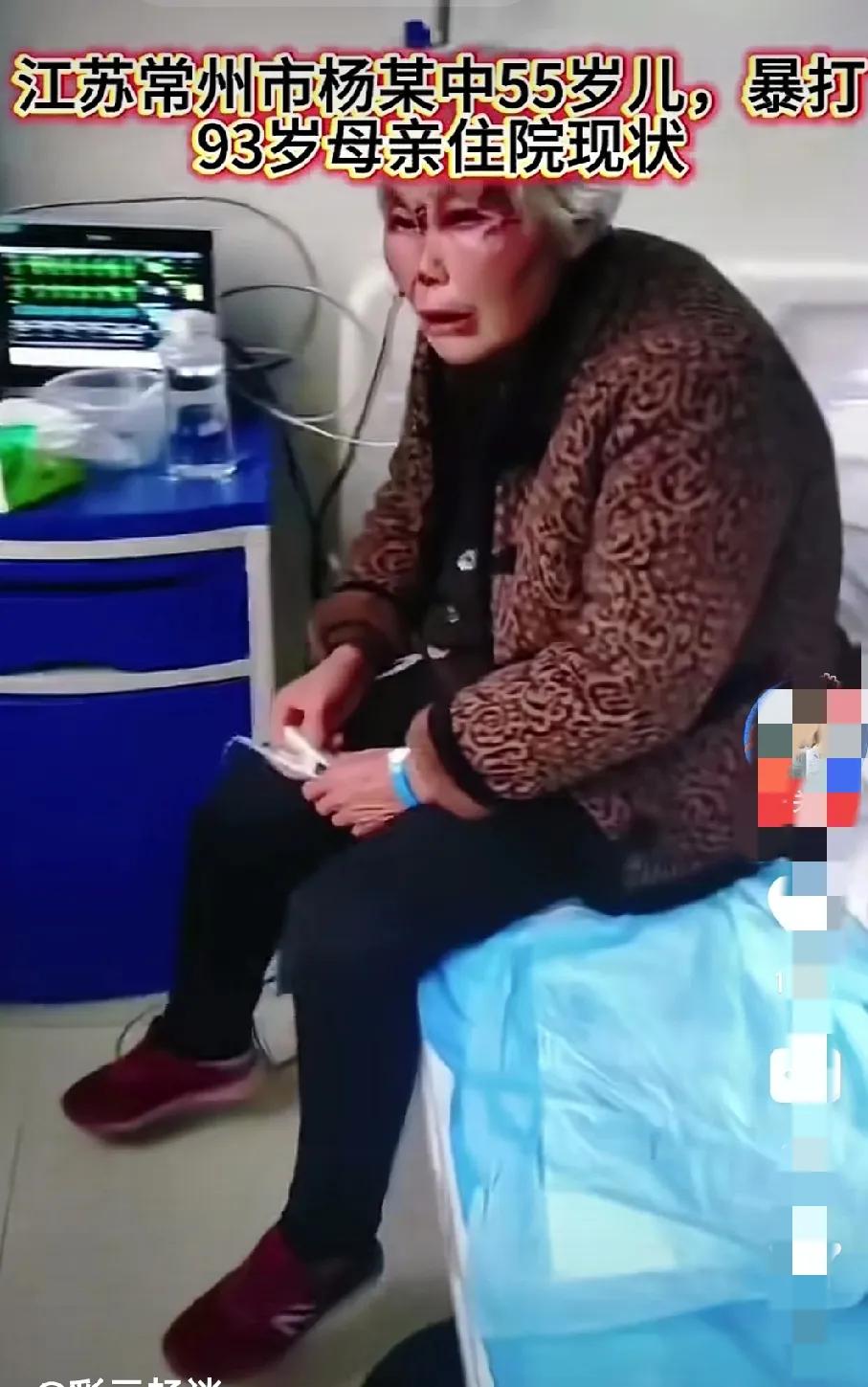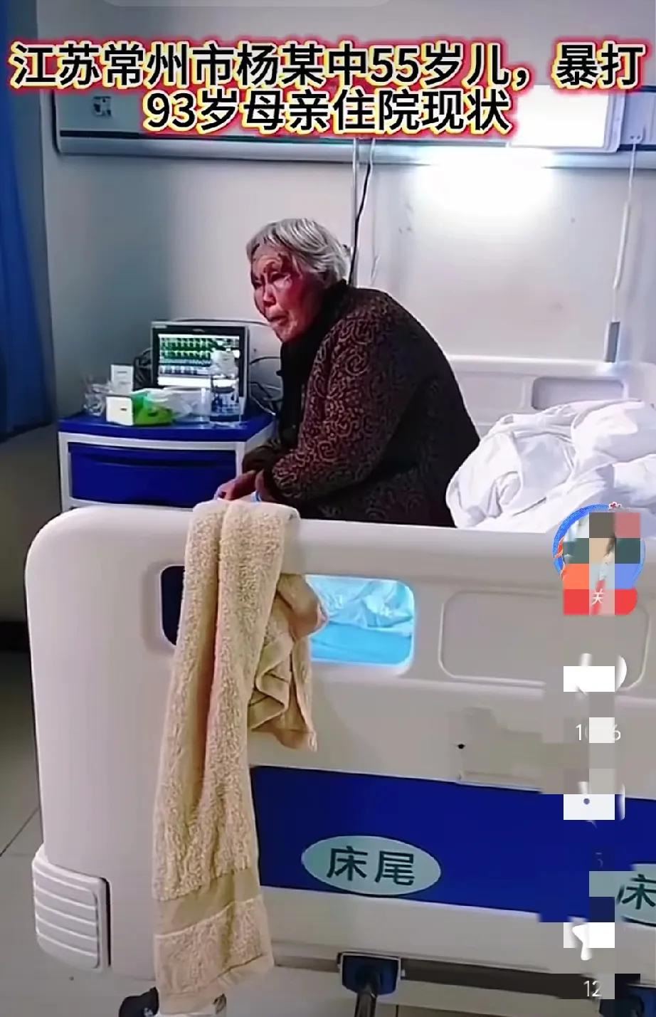 江苏常州市一男子,暴打自己93岁的老母亲,老人被打的眼角,嘴角都是伤痕累累。 打自己老母亲的男子55岁,结过三次婚,一个老婆生一个儿子。 老太太有老年痴呆症,就因为自己老母亲记性不好,记不住事,经常找不到自己要找的东西,就说是儿媳妇拿了她的,男人非常生气,就暴打自己的母亲。 这视频也是男子的二儿子拍摄的, 男子当着自己儿子的面打自己的妈, 是在给儿子做榜样。 等他老了,儿子也会照着做。 老人家四个女儿,37岁才生了这个儿子,好不容易生了个儿子,从小肯定是娇生惯养,百般疼爱,没教育好。 不管自己的妈怎么样,都不应该动手打。 万事孝为先……
