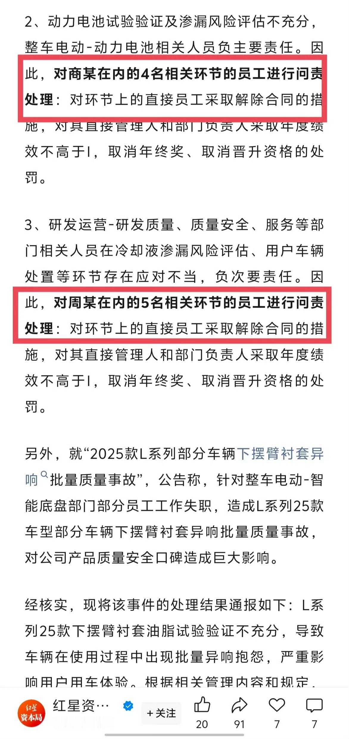 理想汽车内部就“部分2024款MEGA车辆出现冷却液渗漏批量质量事故”以及“2025款L系列部分车辆下摆臂衬套异响批量质量事故”发布了两则处理公告。大概内容就是:解除合同,取消年终奖,取消晋升资格。