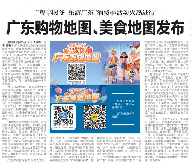 第十五届全运会正持续激发消费活力,由赛事带动的文商旅消费预计总消费规模将突破1500亿元。11月14日,记者从广东省商务厅召开的媒体通气会获悉,作为“粤享暖冬乐游广东”消费季活动的重要一环,“广东购物地图”与“广东美食地图”正式发布,给广大市民游客提供“一图在手,畅游粤购”的便捷服务。这是广东激活冬季消费市场、推动消费持续升温的一项具体举措,也是深化商文旅体融合、优化消费体验的一次积极探索。