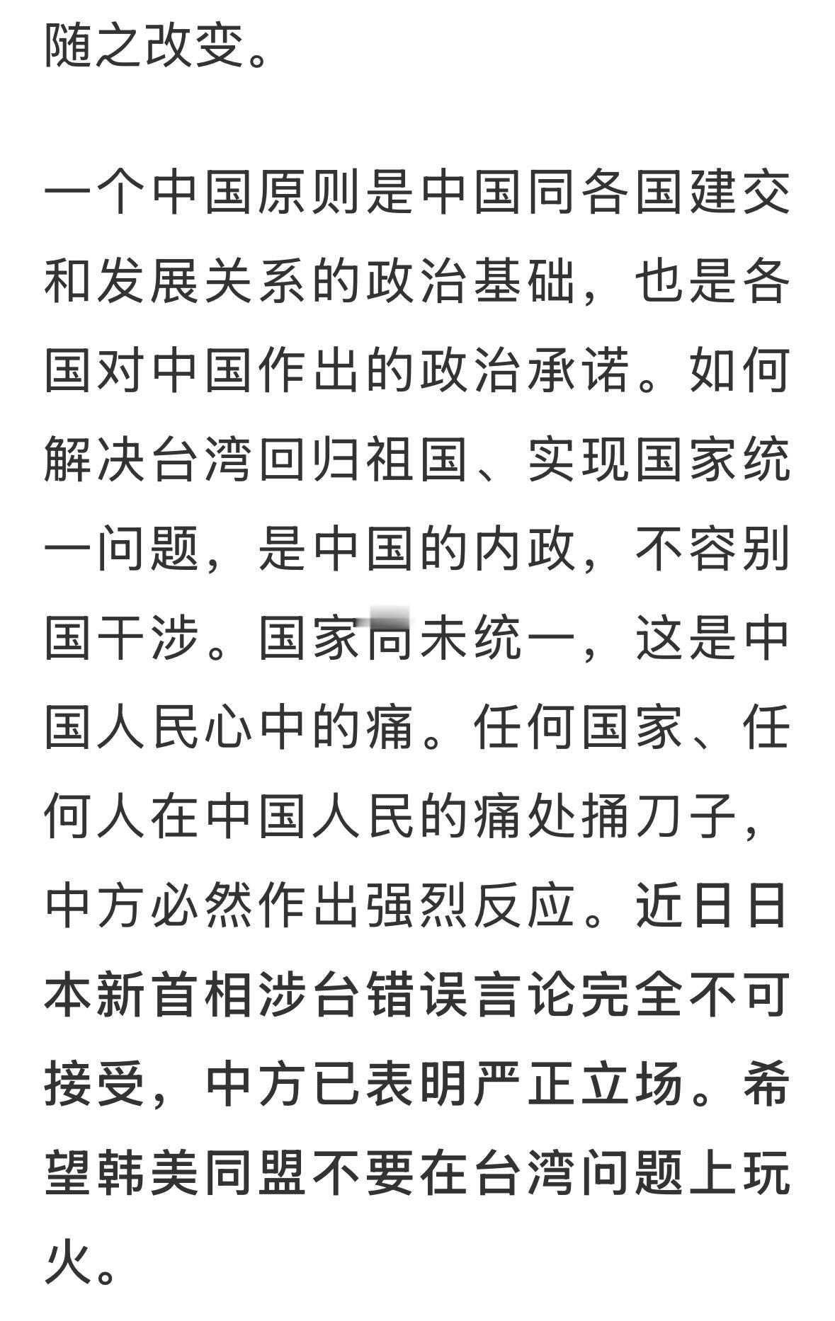 日本的高市早苗惹怒中国,受到严厉批判,警告韩美同盟不要在台湾问题上玩火。不允许外国干涉是中国解决台湾问题的底线,和平统一是我国基本国策,不放弃非和平方式,是保障台海和平、国家统一的重要条件,中国对外来势力零容忍!