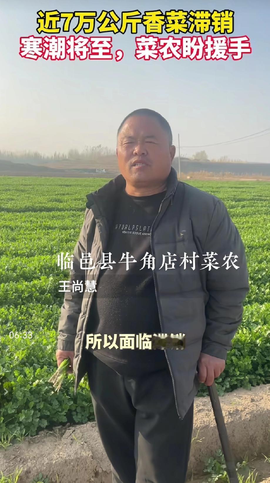 德州临邑临盘街道牛角店村菜农种的香菜终于到了可以出售的时间,确面临的香菜滞销困境。2025年11月14日,当地菜农王尚恩种植的40亩“铁杆青”香菜,近7万公斤面临滞销。原因是往年的收购客户没来收购,而寒潮即将在两三天后降临,这可能会影响香菜品质。菜农希望有热心市民和爱心企业能帮忙销售一部分香菜,以减少损失。(来源于德州晚报)