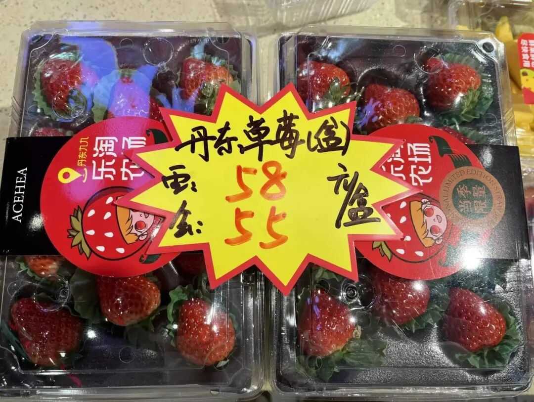 随后,记者来到建国路上一家水果店,看到店内的3J级智利车厘子售价128元/斤,会员价123元/斤;丹东草莓售价58元/盒,会员价55元/盒,里面共有11颗草莓,折算下来一颗草莓在5元左右。
