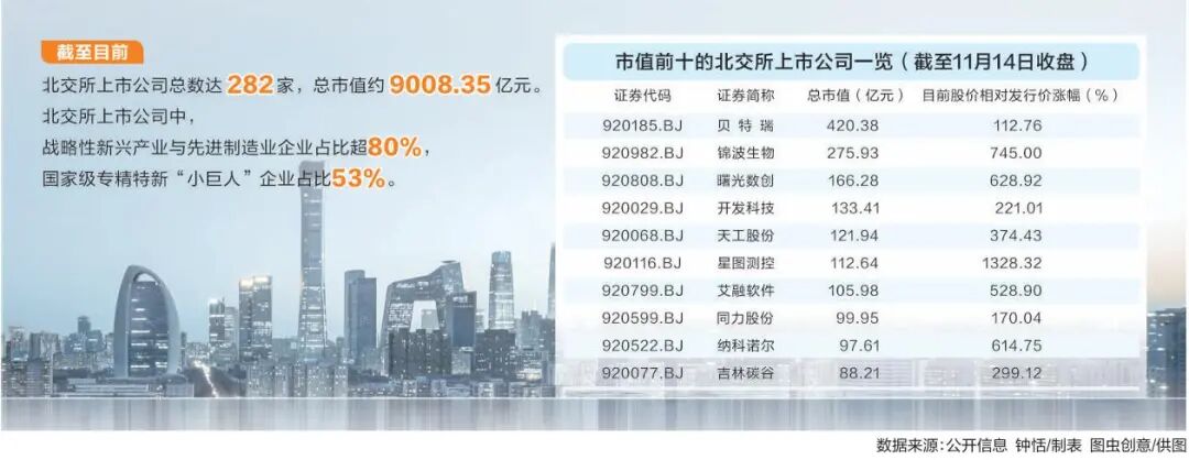 经过四年发展,北交所市场规模显著增长,截至11月14日,北交所上市公司总数达282家,总市值约9008.35亿元,迈向万亿元大关。根据证监会数据,北交所现有上市公司中,战略性新兴产业与先进制造业企业占比超80%,国家级专精特新“小巨人”企业占比达53%,创新主体集聚效应明显。