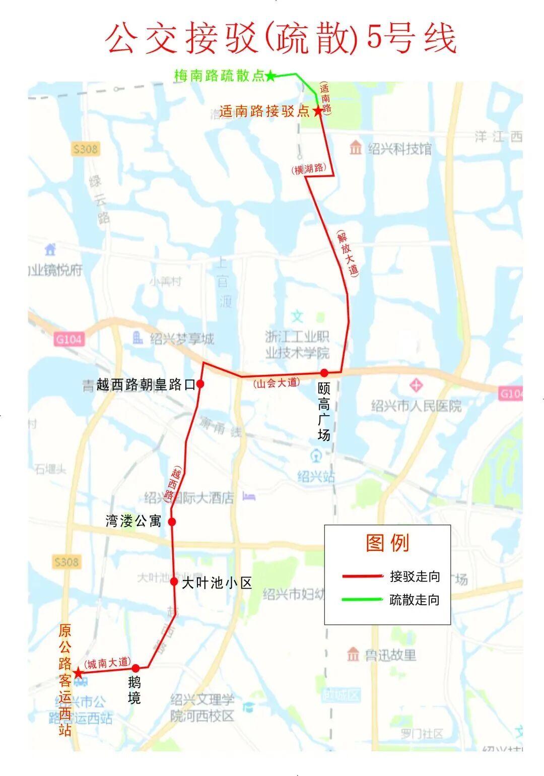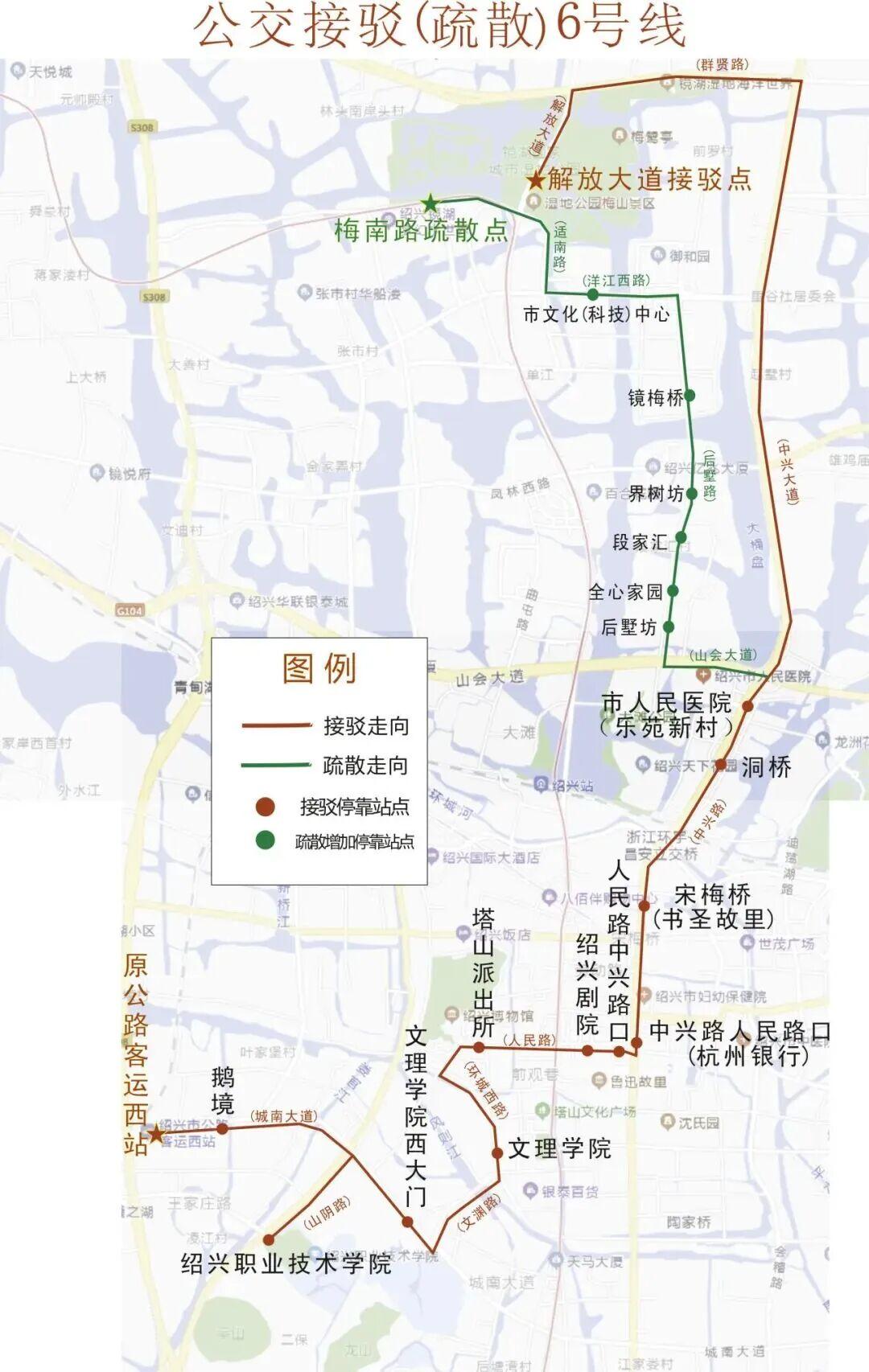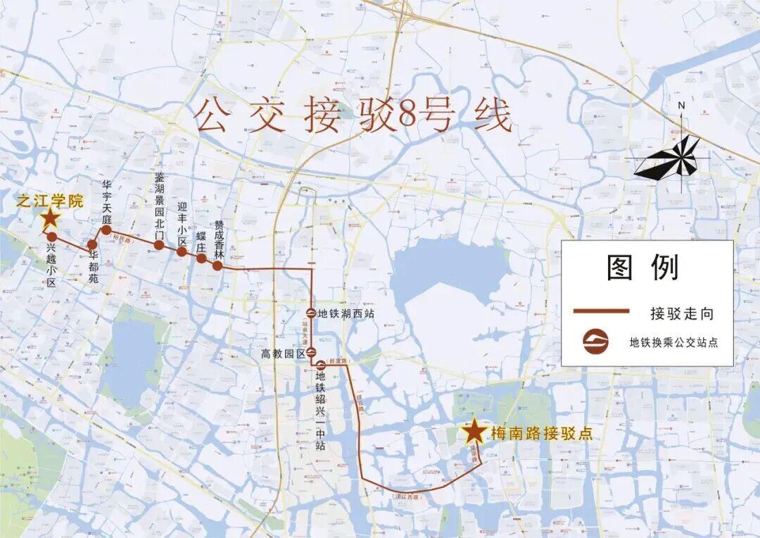 接驳线路走向:之江学院—越州大道—兴越路—笛扬路—裕民路—站前大道—群贤路—绿云路—洋江西路—望湖路—梅南路接驳点。