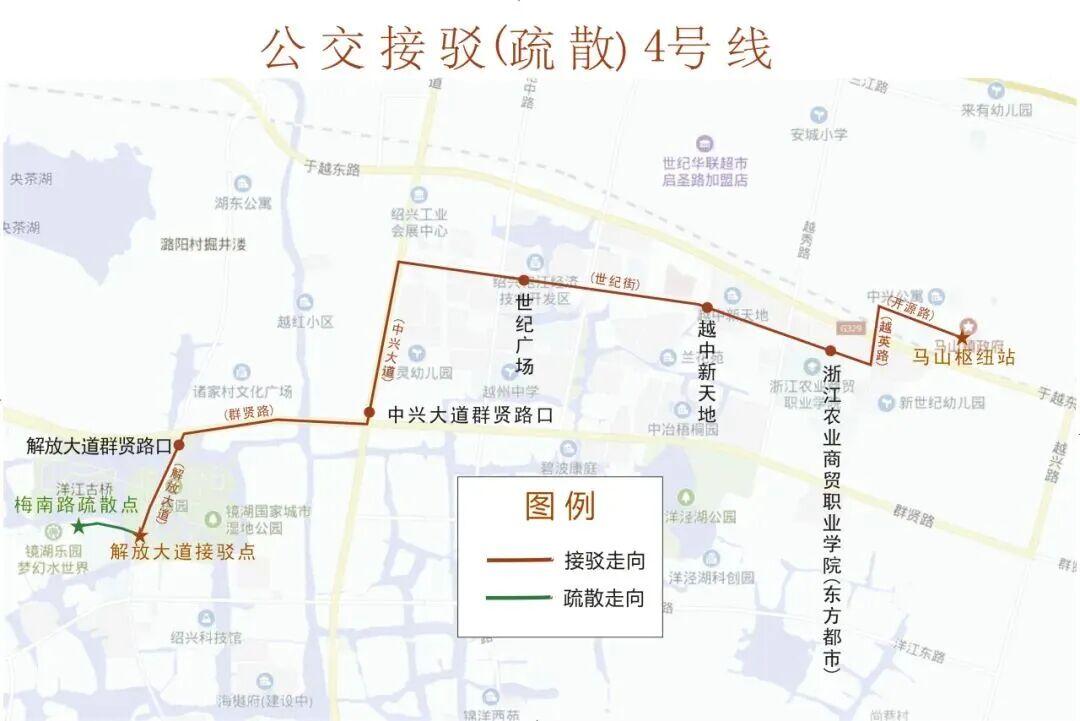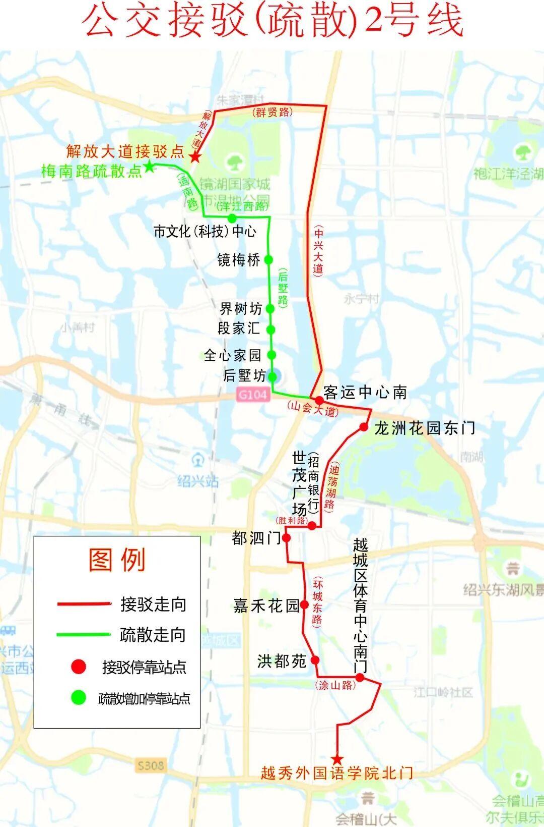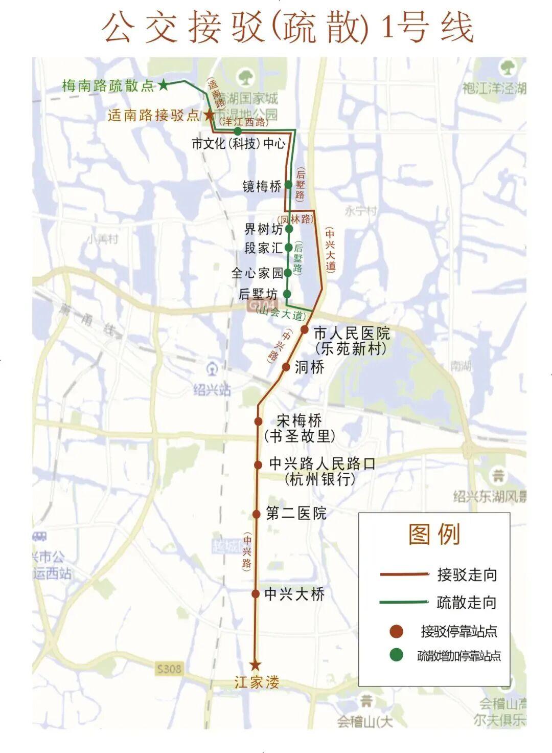接驳线路走向:之江学院—越州大道—兴越路—笛扬路—裕民路—站前大道—群贤路—绿云路—洋江西路—望湖路—梅南路接驳点。