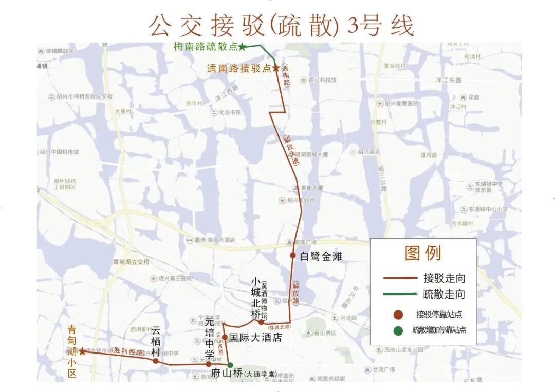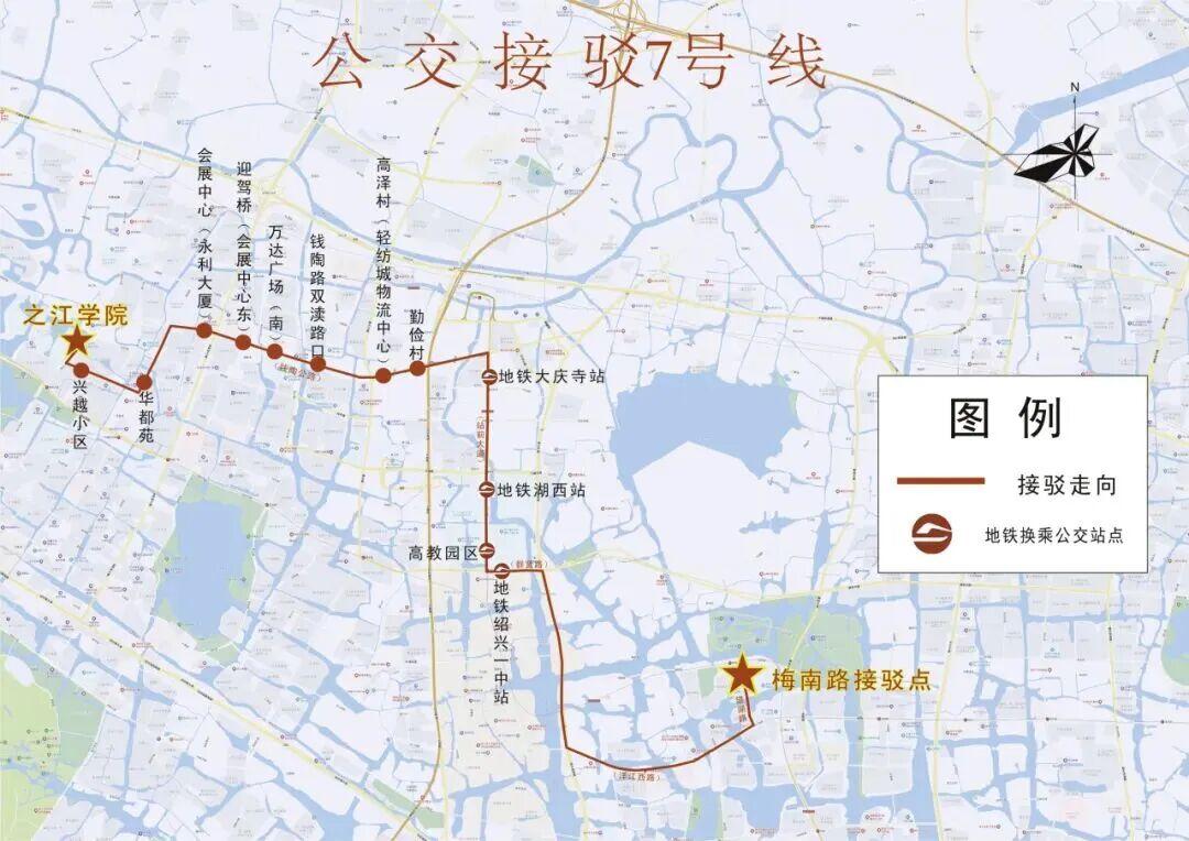 接驳线路走向:之江学院—越州大道—兴越路—笛扬路—钱陶公路—站前大道—群贤路—绿云路—洋江西路—望湖路—梅南路接驳点。