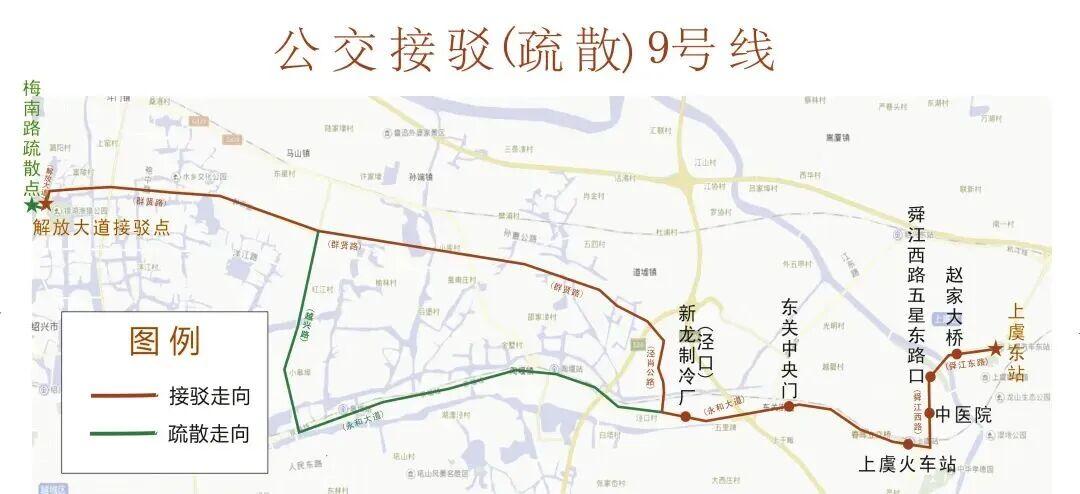 线路走向:上虞东站—舜江东路—舜江西路—永和大道—泾肖公路(返程走越兴路)—群贤路—解放大道—解放大道接驳点(返程从梅南路疏散点始发)