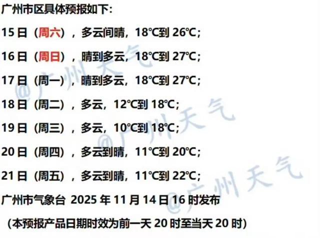 11月15日—16日,全省大部晴到多云。最低气温:粤北大部、肇庆和云浮北部市县14~16℃,南部沿海市县19~21℃,其余市县17~18℃。