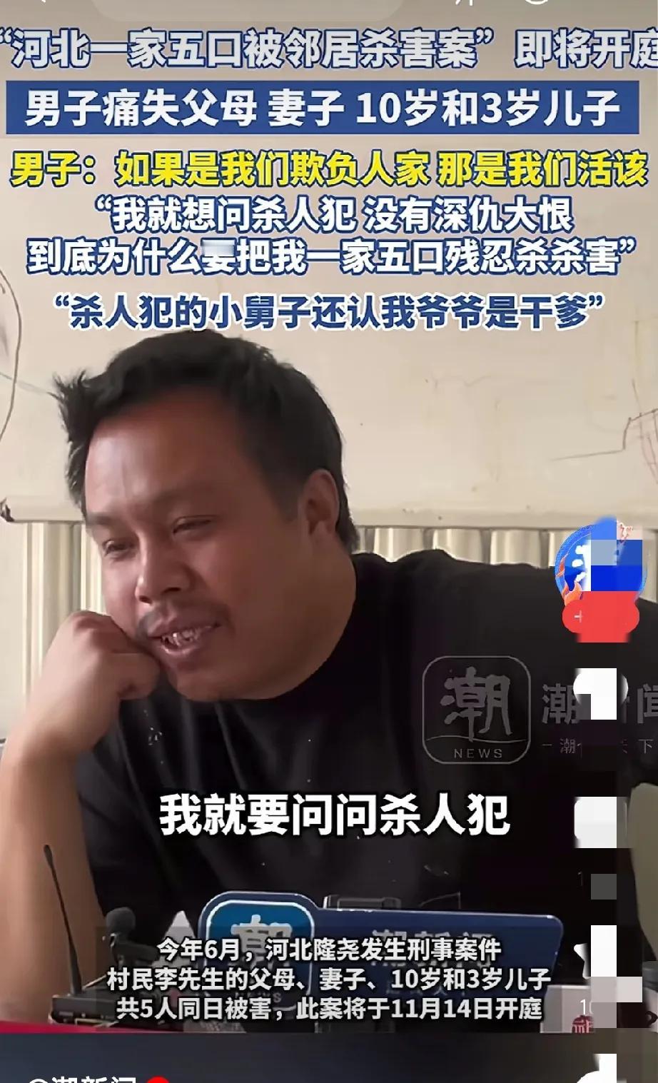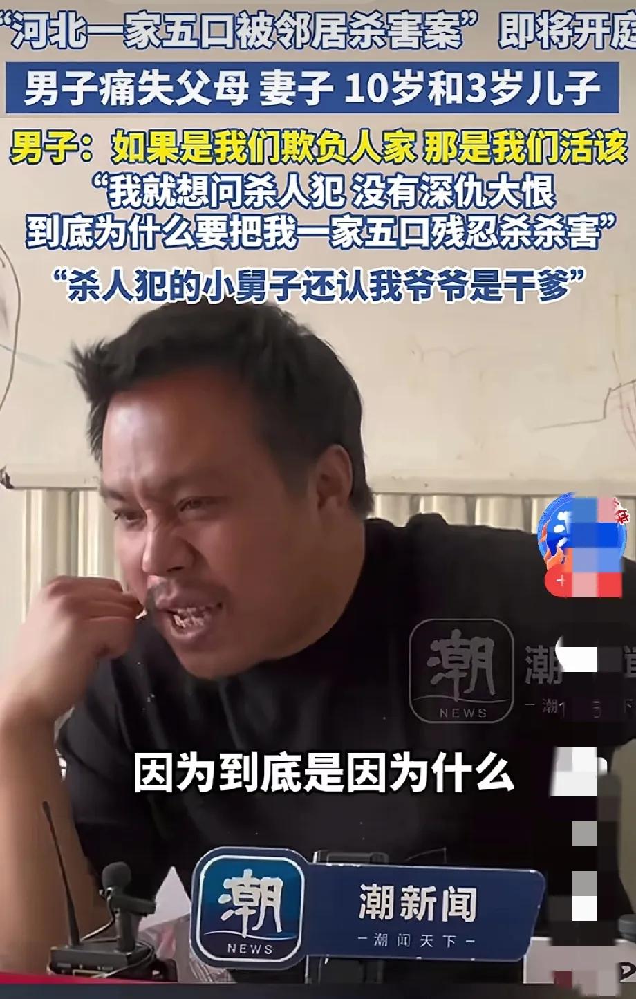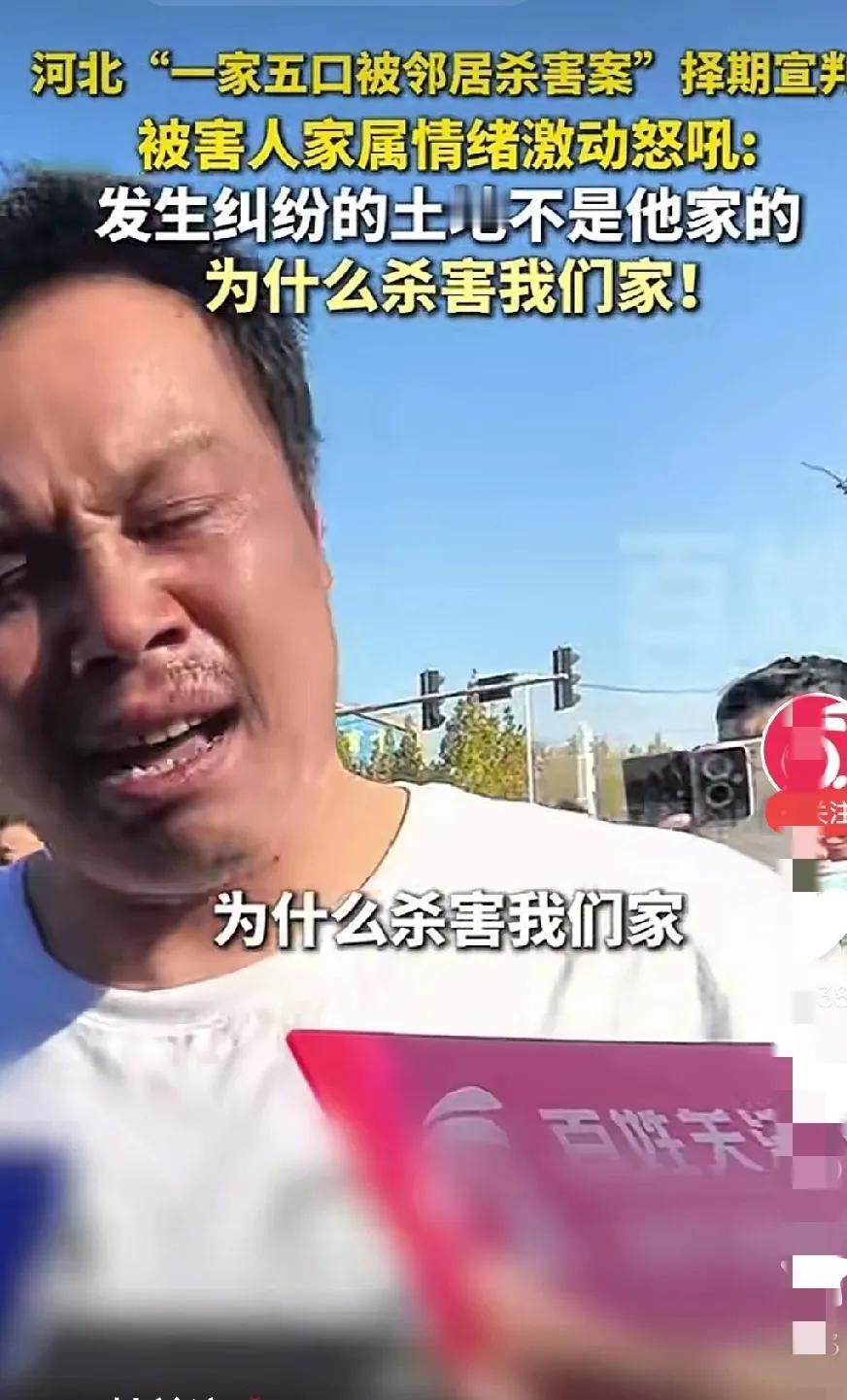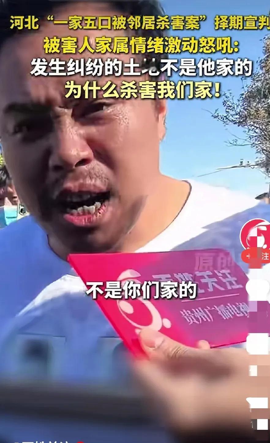 河北一家五口被杀案,发生土地纠纷也不是对方家的。 男主伤心欲绝的质问凶手,两家又没有深仇大恨,为何杀他们全家。 这个凶手到目前为止,还有他的家人,都没有回应过,为何要把事情做这么绝。 杀人犯的小舅子还认这家男人的爷爷是干爹,还连带着有点亲戚关系。