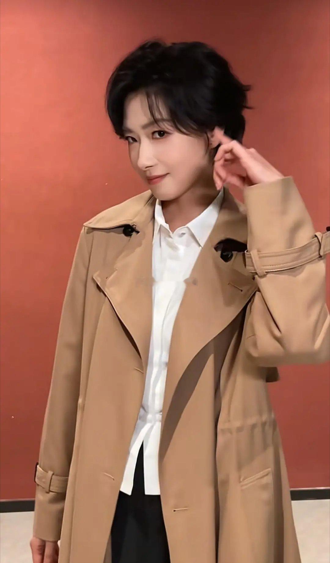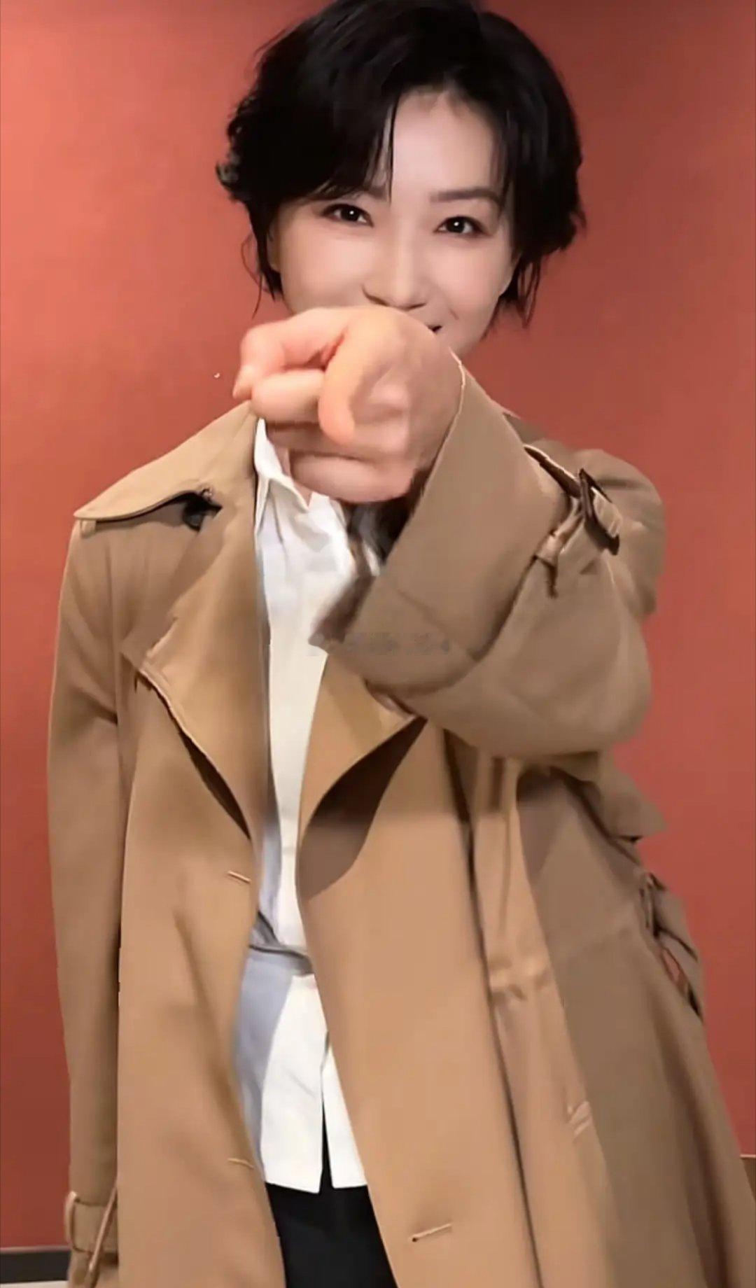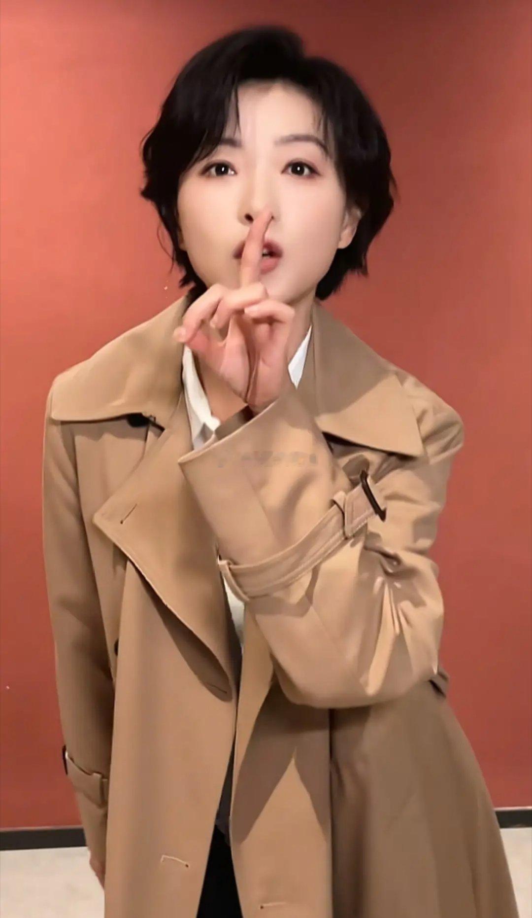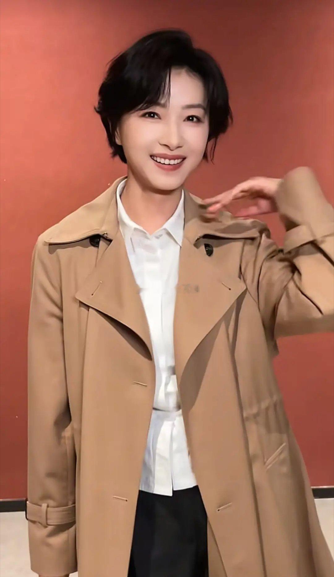 43岁的万茜跳手势舞时造型吸睛:短发利落,大衣配白衬衫简约又洋气,减龄效果显著,