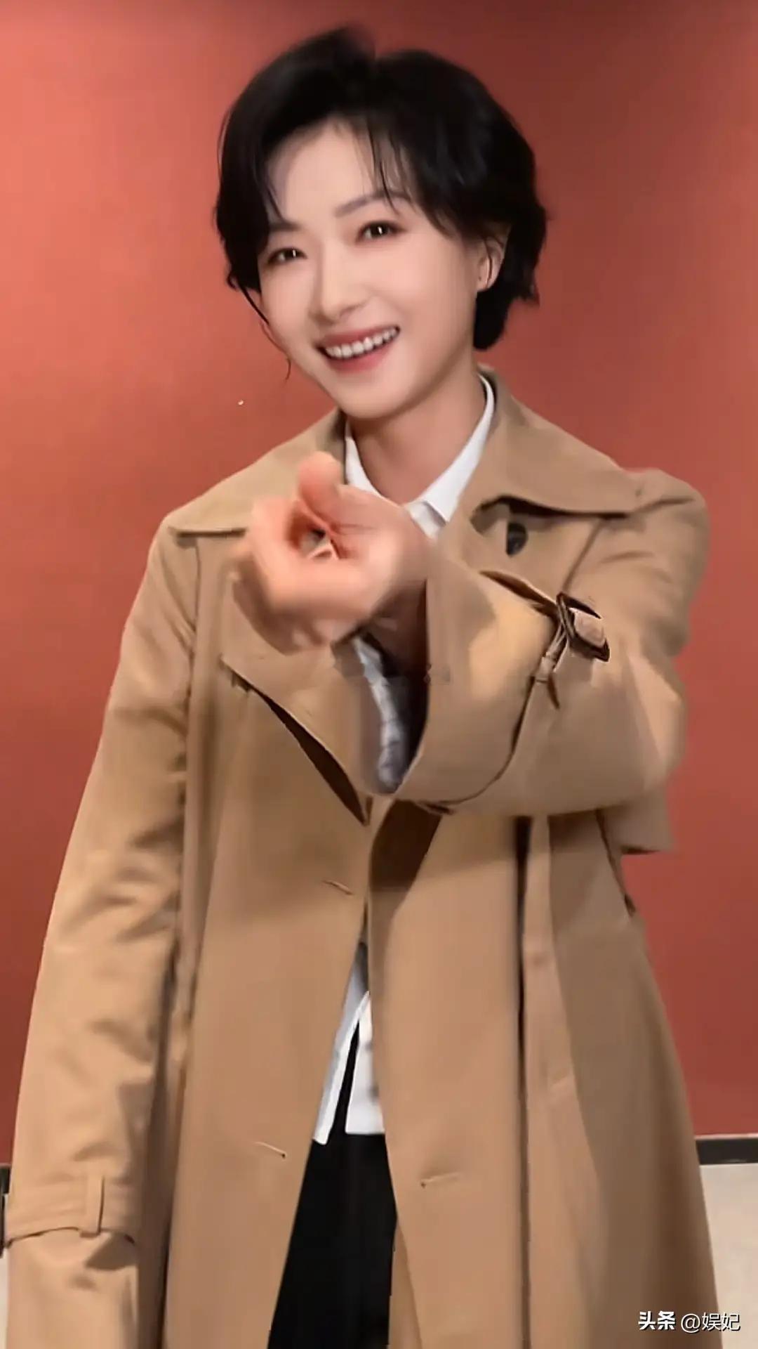 43岁的万茜跳手势舞时造型吸睛:短发利落,大衣配白衬衫简约又洋气,减龄效果显著,看起来嫩得像28岁,灵动又有活力。