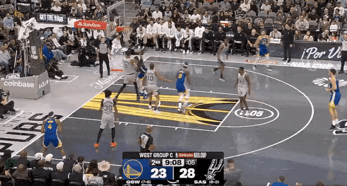 虎扑11月15日讯NBA杯小组赛,勇士对阵马刺的比赛正在进行中。