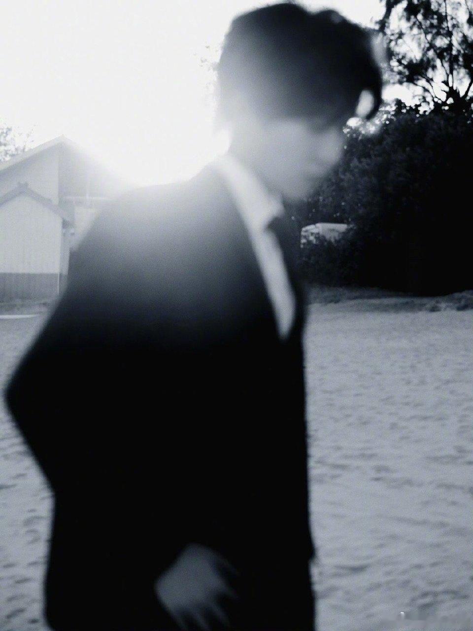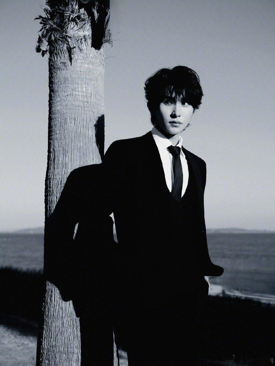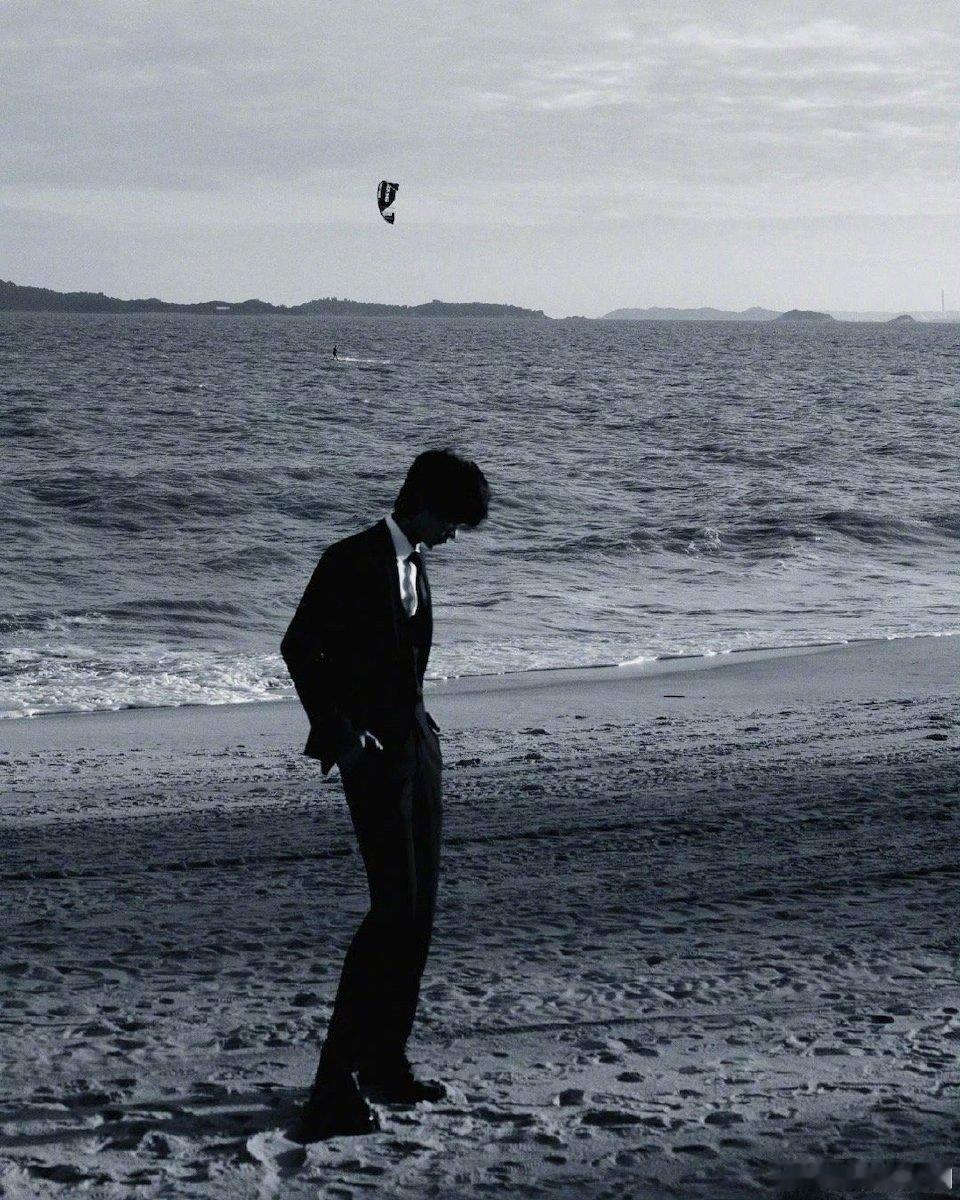 张集骏金鸡奖身着帅气的黑色西装在海边,配文“风大到差点儿给我吹中分了”,果然你们