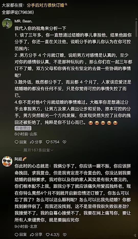 现在的网友真是越来越清醒了,女生在网上哭诉前男友订婚,本想一起声讨男生,结果网友全站男生这边。女生在抖音发布一条哭诉视频,内容是哭诉自己与相恋3年的男友分手后,前男友不到四个月就和现女友会见双方家长并订婚,视频里女生满脸委屈和不忿,似乎全部的过错都在男方。本想以此唤起网友的同情和对男生的指责。结果却一边倒的全站男生,细心的网友发现女生在视频中全程只在诉说自己和前男友在一起三年抵不过现女友的四个月自己很难过,却一句不提分手原因,也不说为何在一起三年也没能结婚的原因。所以纷纷回应男生离开的对。既然已经分手那么男生多长时间结婚都属于自己的自由没有任何问题,反倒女生这样诋毁男生无非只是内心不平衡,看到男生离开自己后可以当作无事发生并快速的与另一个女生相恋甚至结婚后愤恨不平想引起网络暴力声讨男生实在不应该。你们觉得这件事情是谁错呢?