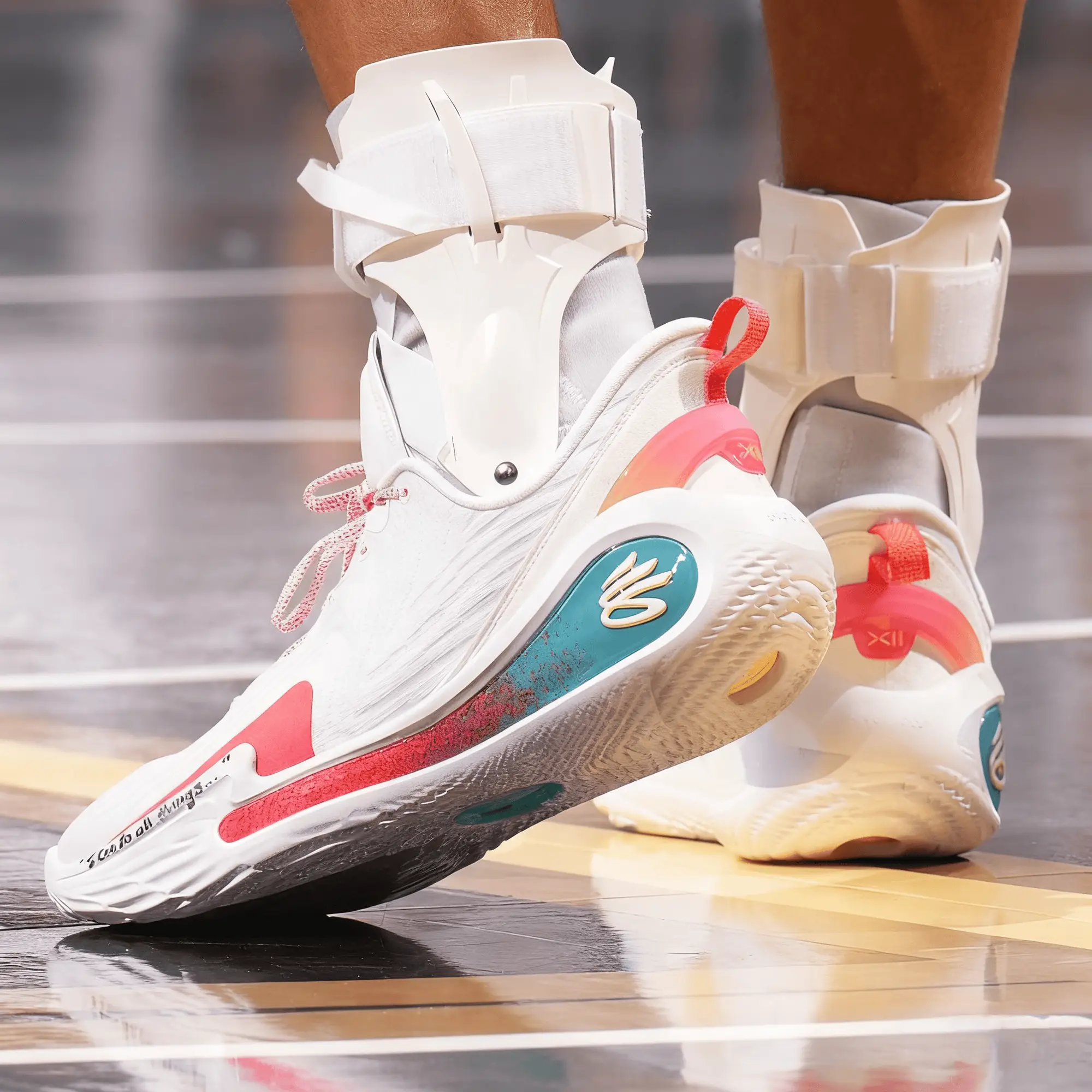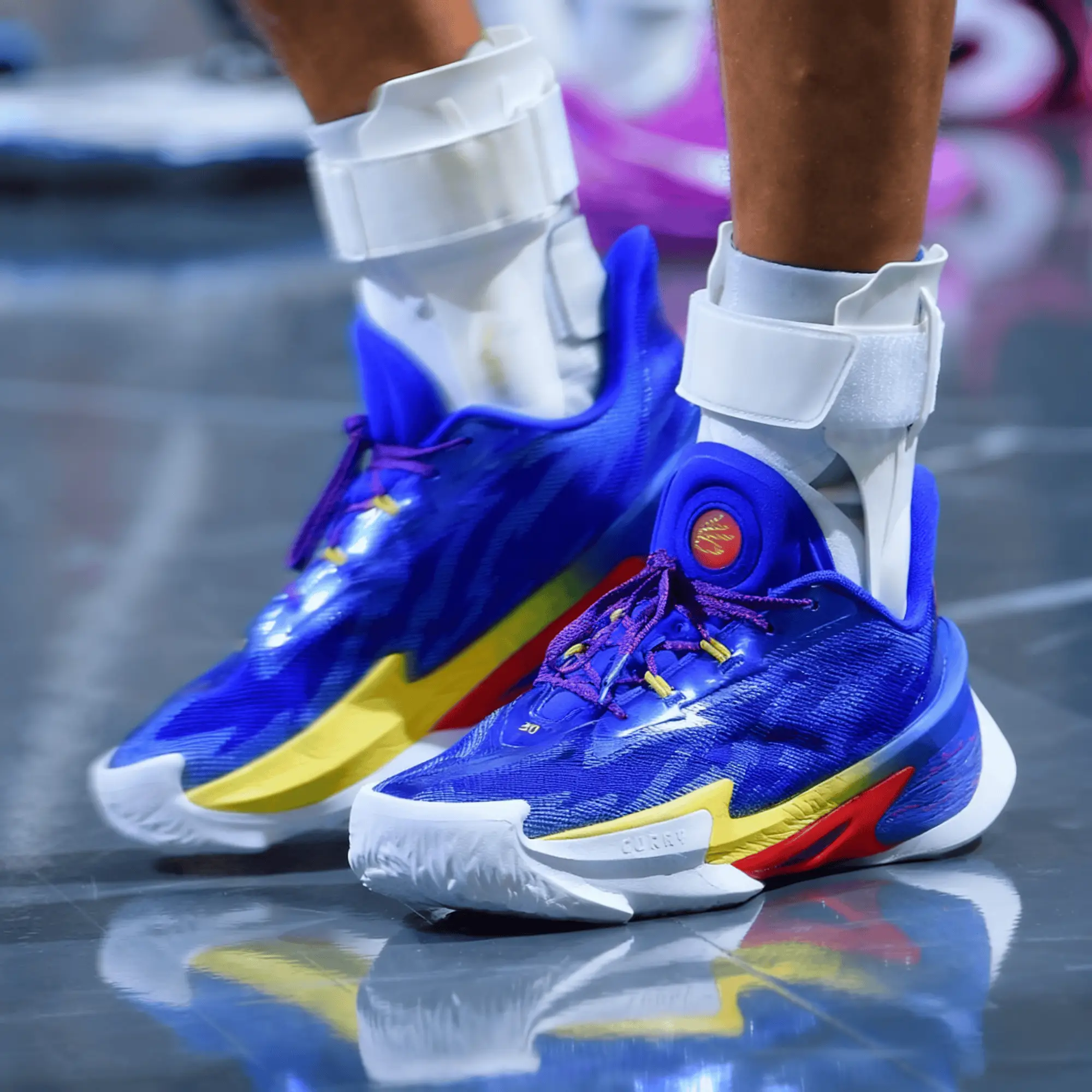 比赛上半场,库里穿着慈善基金会配色UACURRY12“EatLearnPlay”,下半场换穿蓝色UACURRYSeries7。