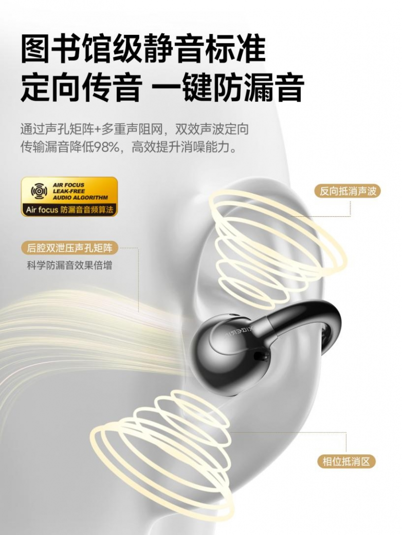 人性化配套升级更显贴心。针对耳夹式耳机普遍存在的漏音问题,MC20搭配专属APP推出一键防漏音功能,在自习室、图书馆等安静环境中,可确保旁边听不到丝毫声音,避免尴尬场面发生;同时支持左右耳机随机入仓,搭载声道检测识别技术,自动精准匹配左右声道,使用更便捷。