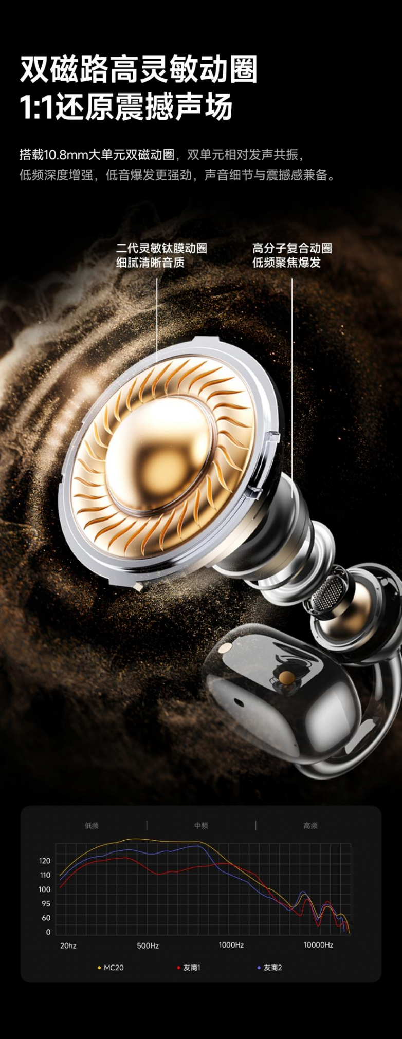 音质表现上,MC20完成专业级升级。耳机内置10.8mm大单元双磁动圈,双单元相对发声强化低频共振,搭配HIFI级双DSP强芯,融合DMRC动态补偿调音与自研SUPERBASS低音增强算法,让低频澎湃有力,全频段音量动态均衡。同时,产品通过日本音频协会Hi-ResAudio认证,频响范围覆盖20Hz-40kHz,加持LDAC高清解码技术,呈现高于唱片级3倍的原声体验,为音乐爱好者带来细腻通透的专业级听觉享受。