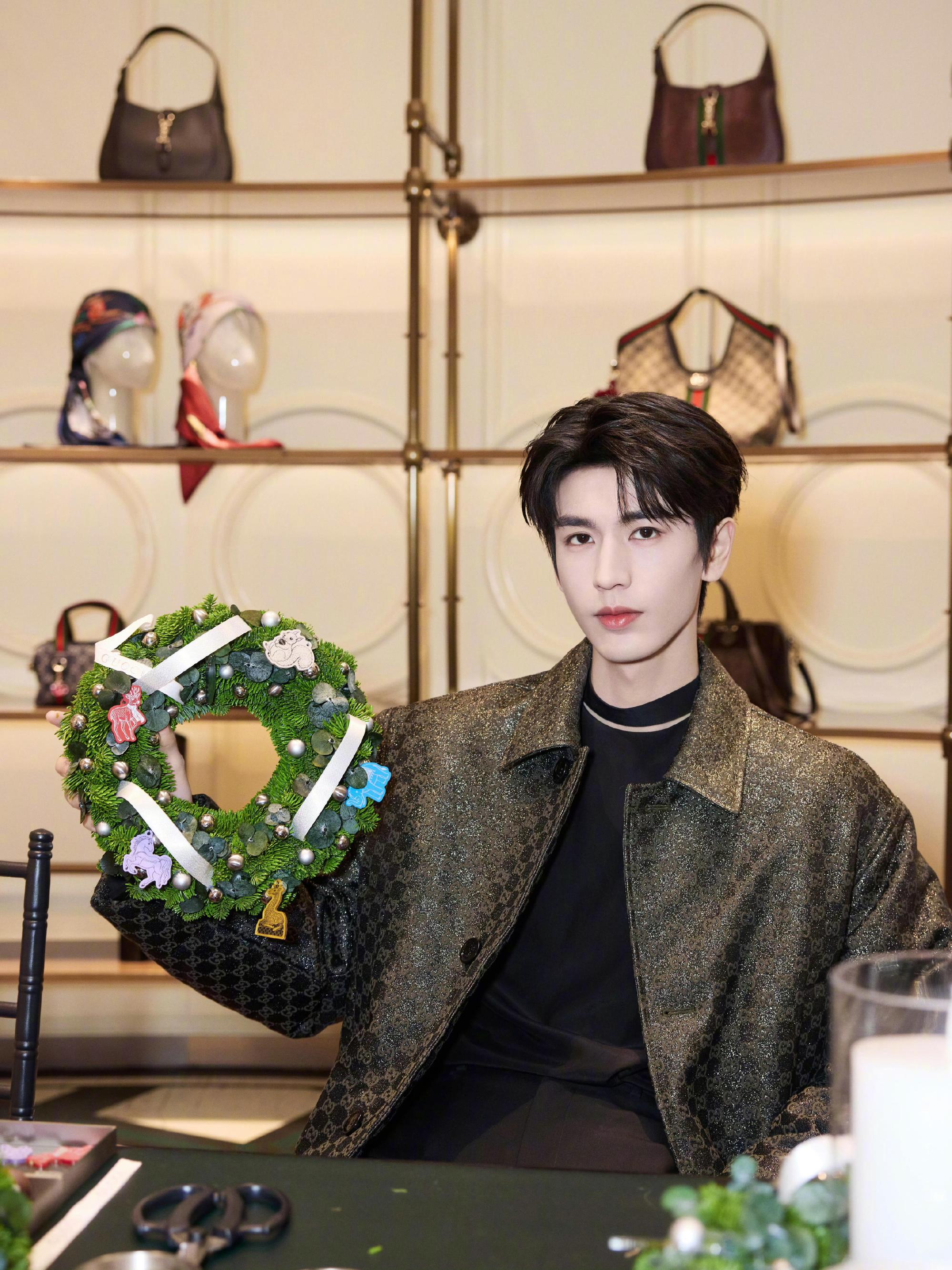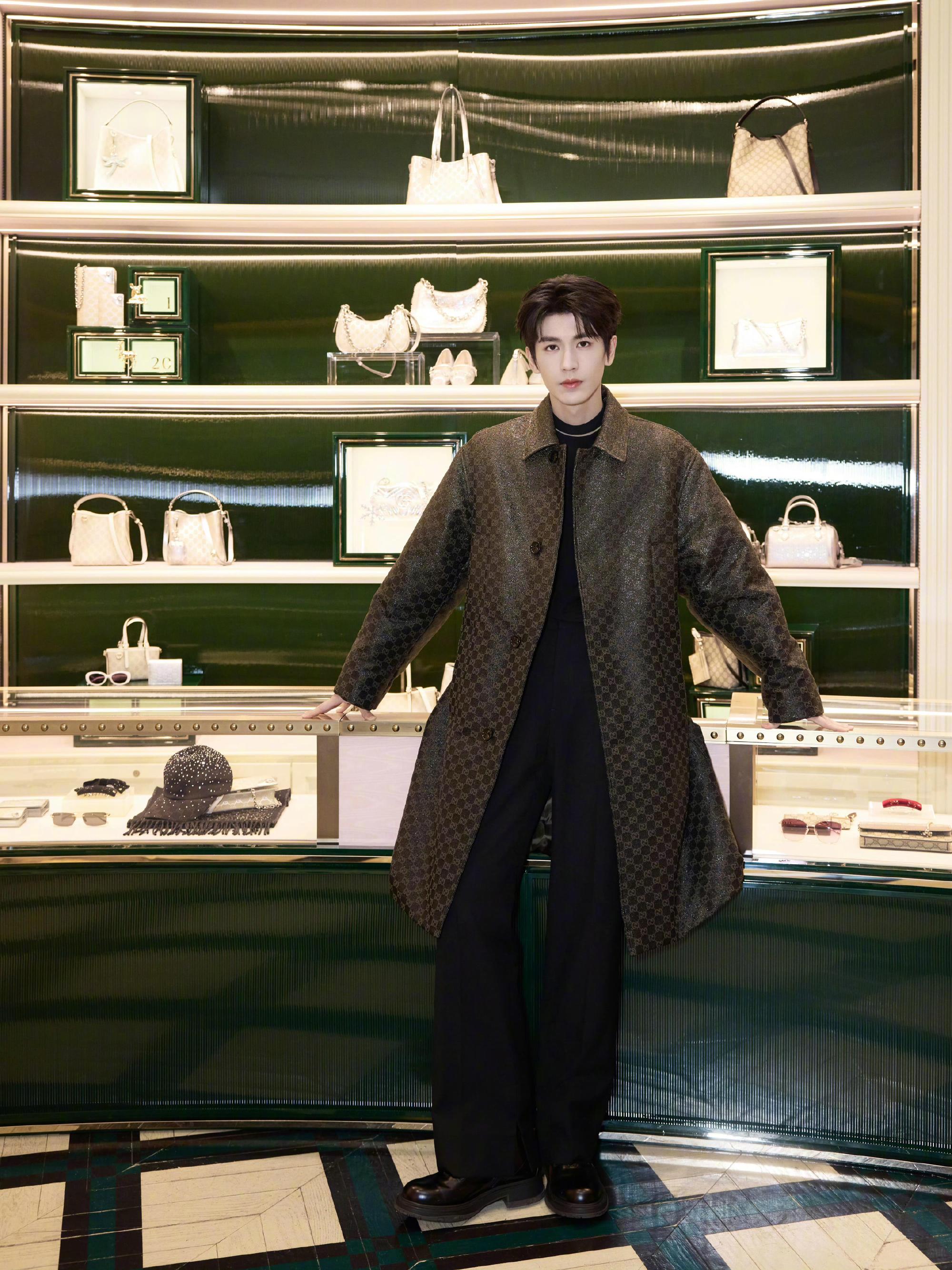 张凌赫出席Gucci品牌活动造型,上身Gucci全logo印花皮质大衣,搭配半高