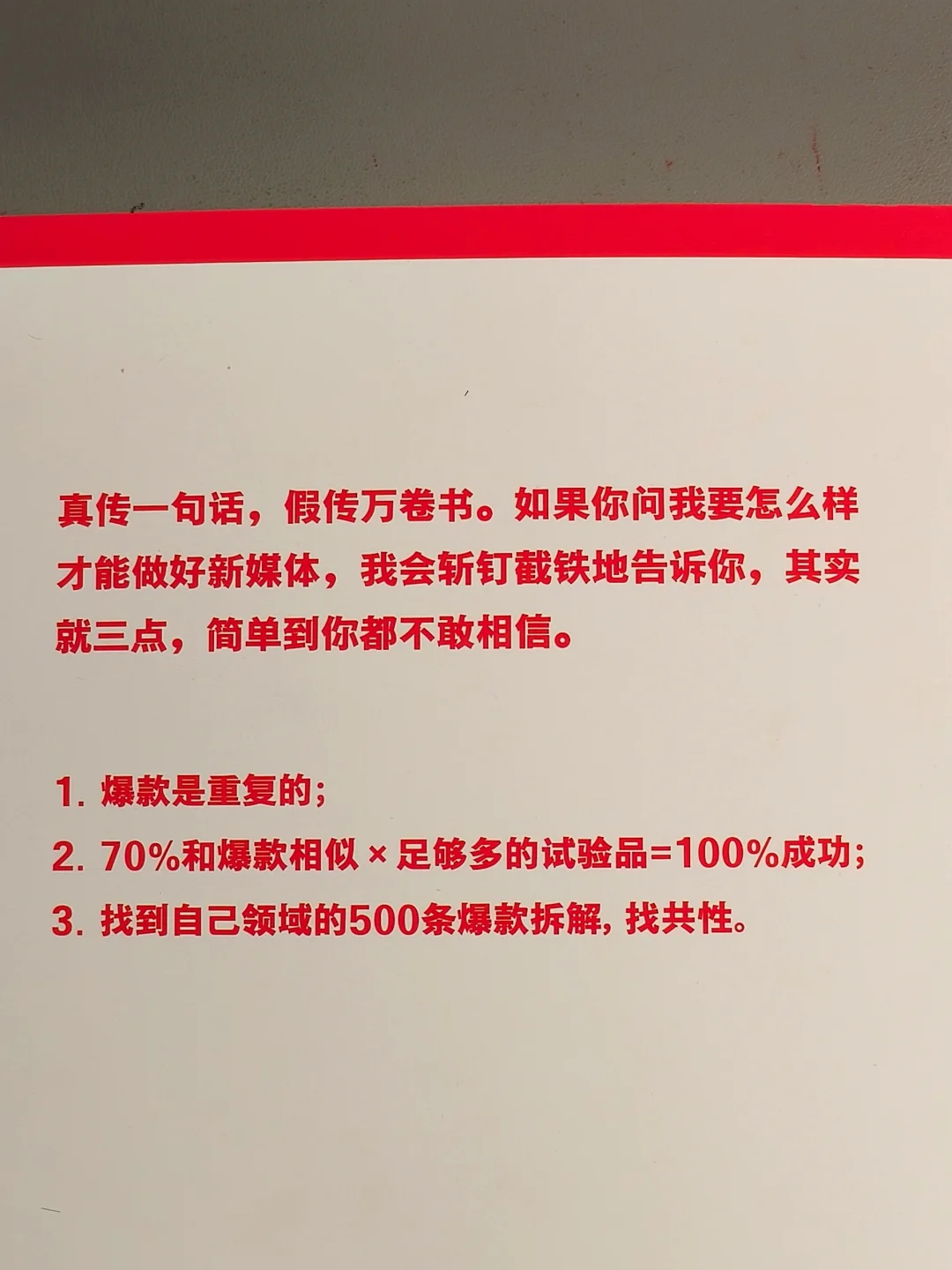 要做“爆款复盘师”。找到自己领域的500条爆款拆解,找共性,把验证过的方法重复用,才能实现流量复利。