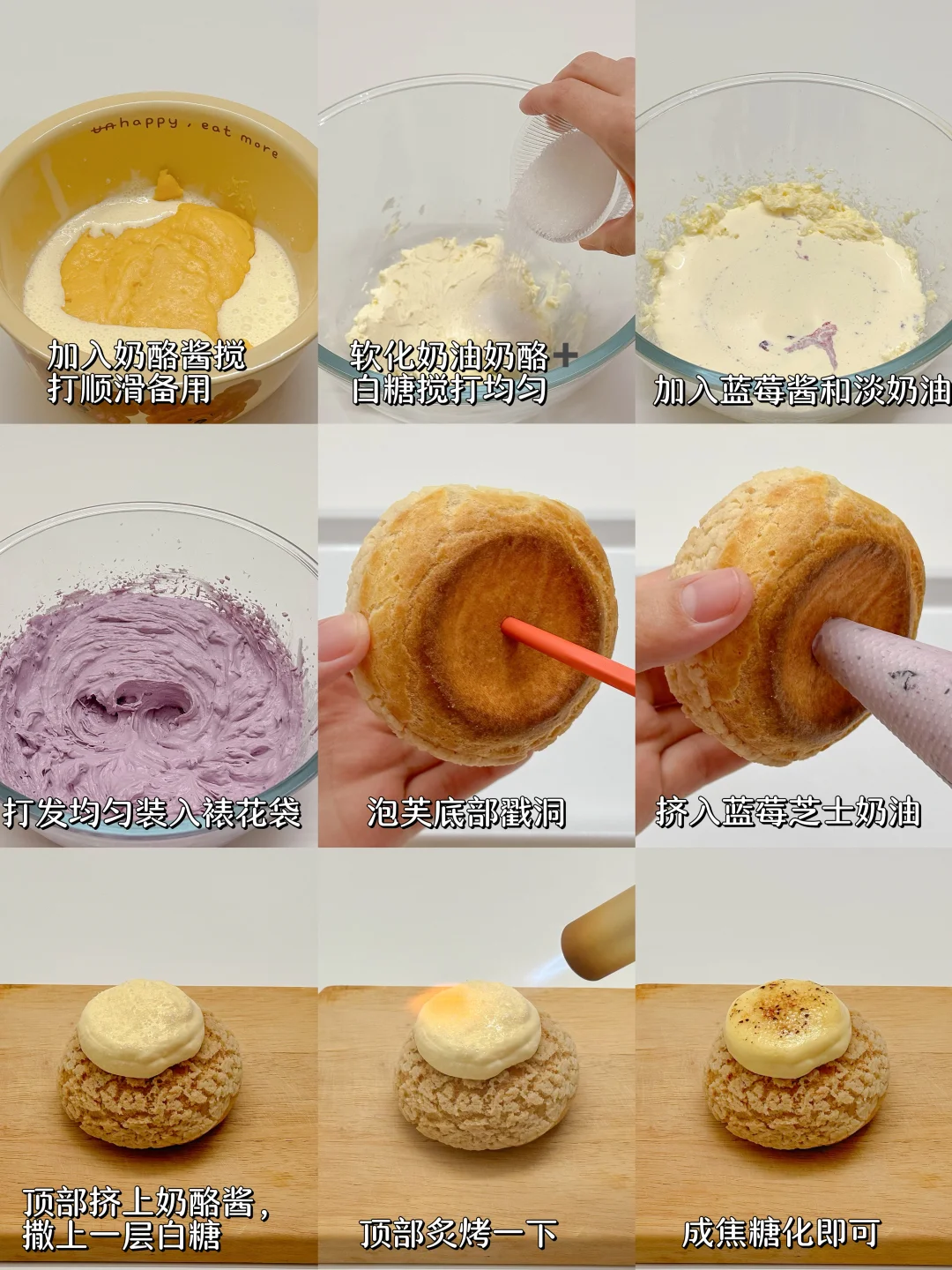 5️⃣软化的奶油奶酪加白糖搅打均匀,加入蓝莓酱和淡奶油打发均匀,装入裱花袋备用;泡芙底部戳洞,加入蓝莓芝士奶油,顶部挤上奶酪酱,撒上一层白糖,用喷枪炙烤一下,成焦糖化即可。