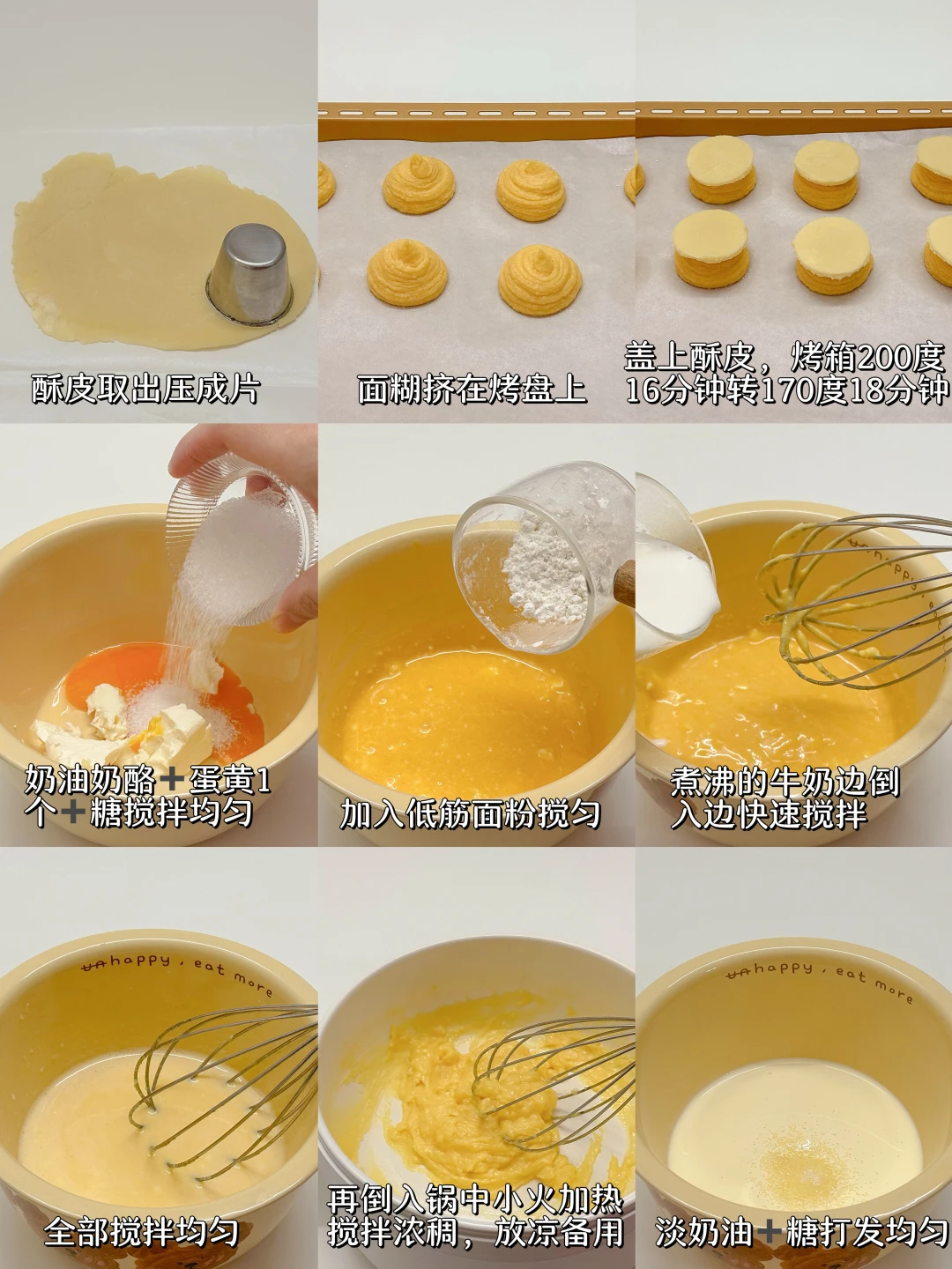 3️⃣酥皮取出压成片,将面糊挤在烤盘上,盖上酥皮,烤箱提前预热,烤箱200度16分钟转170度18分钟。