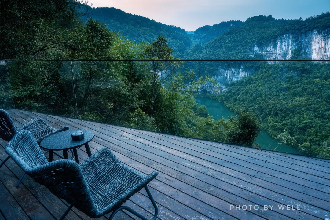 酒店在森林里、悬崖边,景色优美,坐拥得天独厚的自然环境,四周被青山绿水环抱。特别是有五座悬崖客房,就在湄江河上的悬崖边,坐在客房阳台就可看到悬崖下的湄江,惊险壮观。