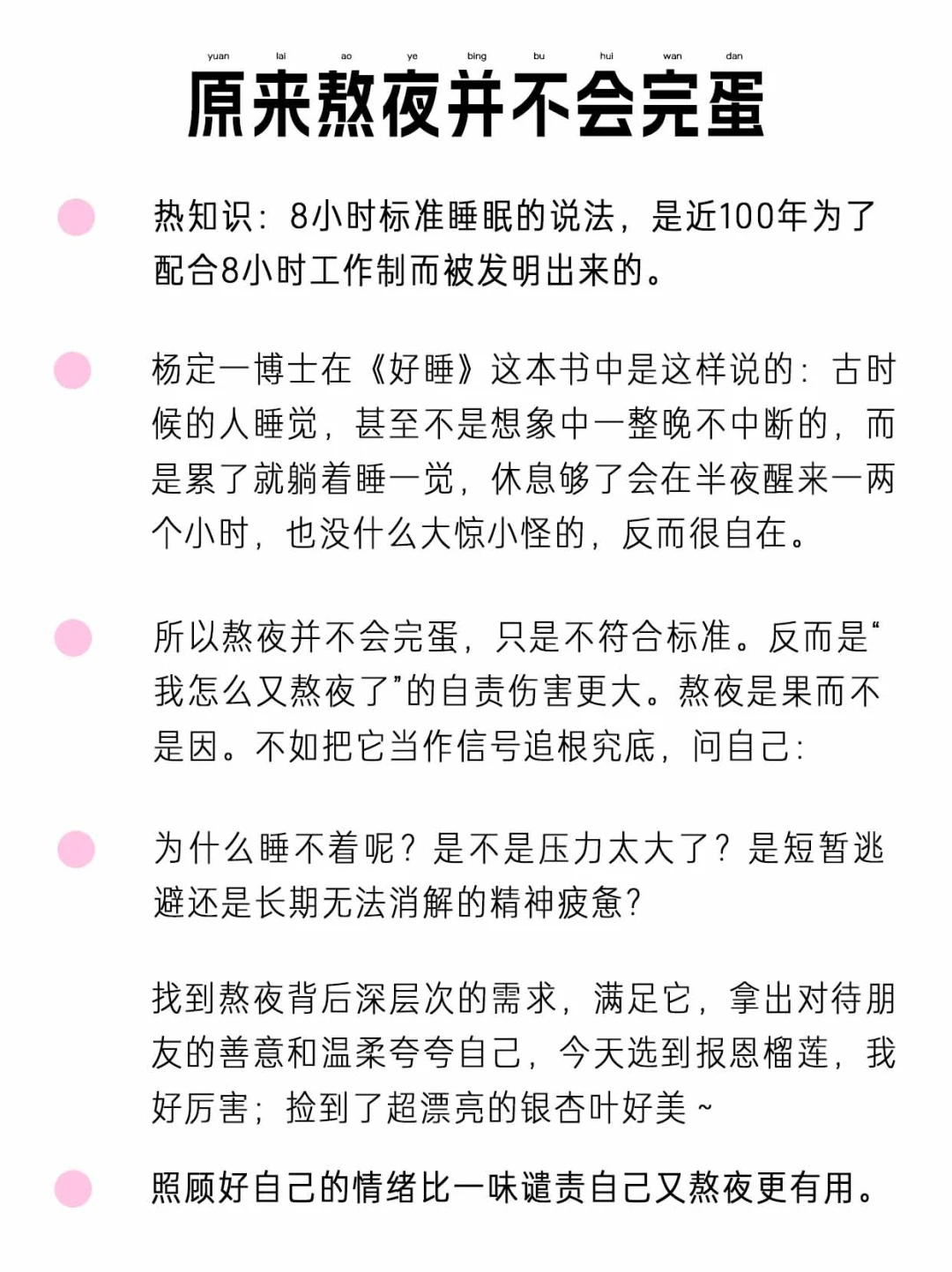 我的意思是 不要因为熬夜而自责 熬夜是果不是因 找到背后的因才是重要的 如果怎样都睡不着 就坦然做点想做的事 泡脚看书正面冥想 照顾好自己的情绪 比1万种养生方法更有用