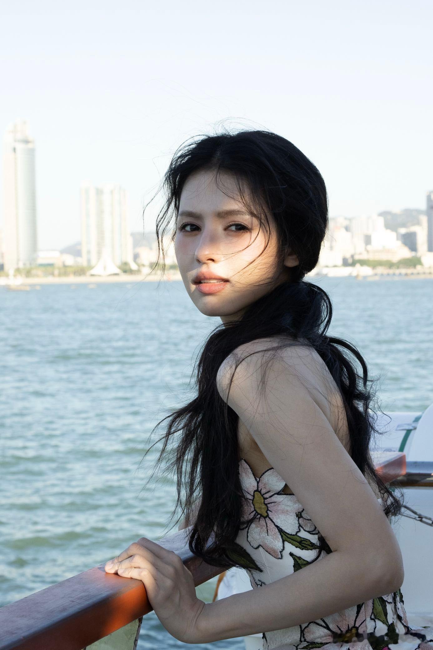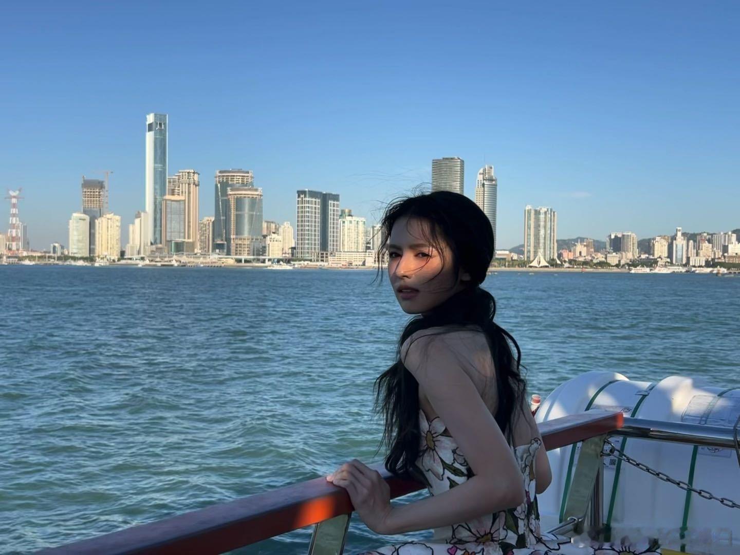 内娱出图速度天花板!蔚蓝海边的裸色长裙造型,浪漫到无以复加,回眸一笑自带光芒,端庄美丽氛围感拉满。