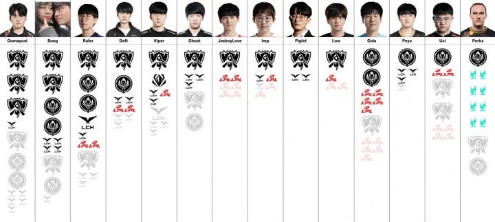 直播吧11月15日讯S15全球总决赛T1击败KT拿下第六冠并完成三连冠,下路选手的荣誉排行图更新。