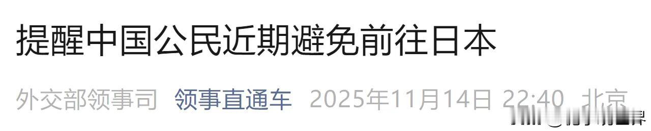 日本明知道不是中国的对手,高市为什么还要硬着头皮对中国进行挑衅? 中国外交部14日发布消息,提醒中国公民近期避免前往日本。 针对日本领导人公然发表涉台露骨挑衅言论,外交部、国防部等都相继向日本发出警告,要求日方必须立即纠正、收回恶劣言论,如果日方胆敢挺而走险,必将碰得头破血流。央视《新闻联播》也用了“三分钟”来警告高市早苗,由于高市的挑衅严重恶化中日人员交流氛围,给在日中国公民人身和生命安全带来重大风险,中国外交部14日发布消息,提醒中国公民近期避免前往日本。个人认为,中国对日本的反击已经开始,而且正在一步步升级,我们老百姓也要有一定的心理准备,一切行动听从党和国家的指挥,外交部提醒“避免前往日本”,我们就不要去日本,在日本的也要保护好自己,不能给国家添麻烦,这也是为了我们个人自身的安全。 在推动两岸统一的进程中,遏制境外干涉势力是反“台独”工作的重点,原本最大的境外干涉势力是美国,日本顶多是个配角、马前卒或小跟班而已,随着中国经济实力和国防实力的不断增强,中美双方角力向有利于中国的方向发展,在中国军力不断增长的情况下,美国逐渐有从台海退场的趋势,而日本却显得很不甘心,高市早苗上台后不断挑衅中国,向中国发出武力威胁,向“台独”发出最严重的错误信号,为“台独”撑腰打气,干涉中国内政,破坏中国的统一进程,问题非常严重,个人认为,从军事实力或经济实力上讲,日本明知道不是中国的对手,高市为什么还要硬着头皮对中国进行挑衅?目的很明确,就是捣乱,就是支持“台独”,破坏中国的统一,企图遏制中国的发展。对高市的具有侵略意味的恶意挑衅,必须要进行坚决的斗争,不管使用任何手段,都要迎面给予痛击,估计下一步中国可能还会有更大更强的动作,这次必须要打掉以高市为代表的小日本右翼势力的狂妄势头或侵略野心,才能顺利完成祖国的统一大业,实现中华民族的伟大复兴。 日本对华态度 高市早苗挑衅中国