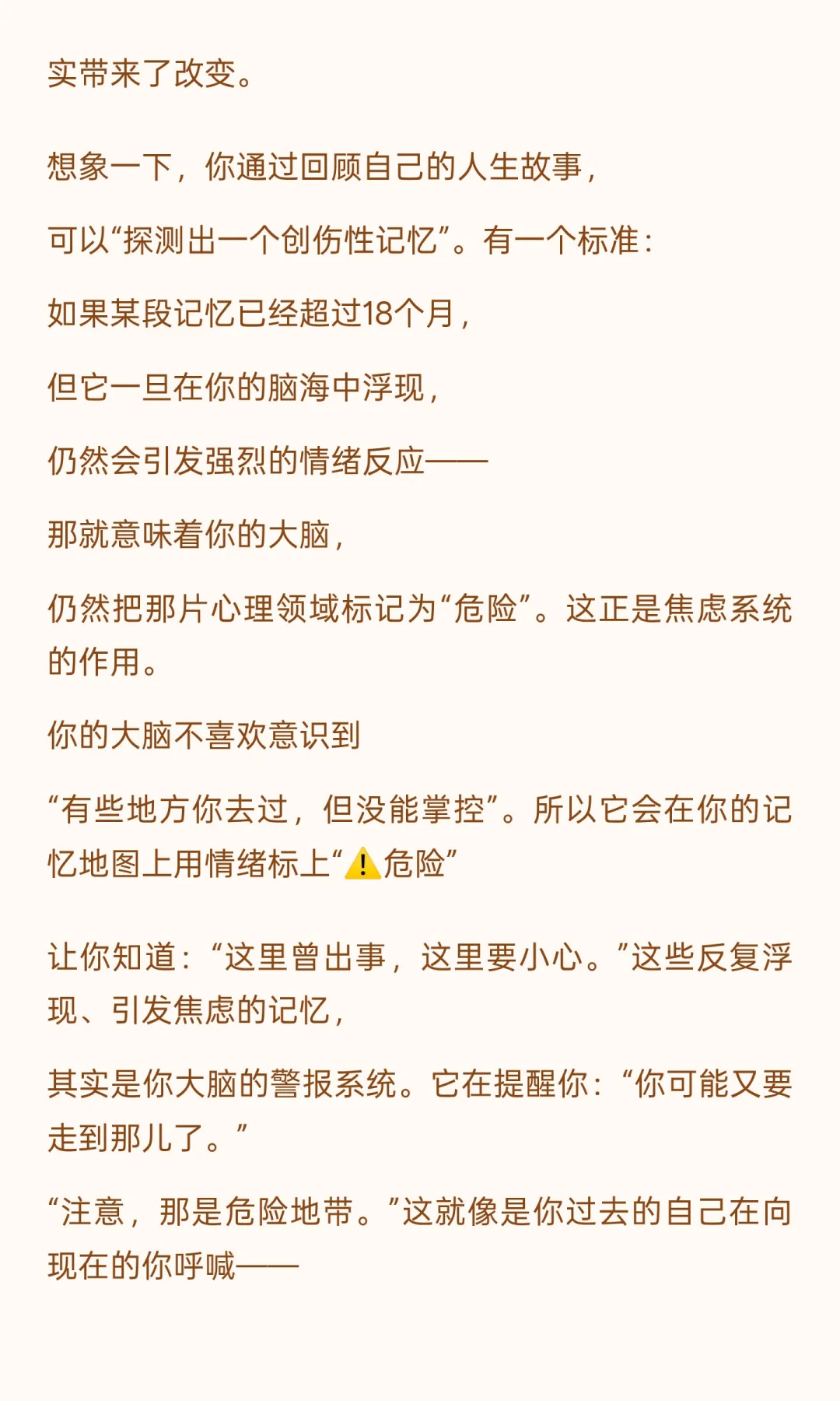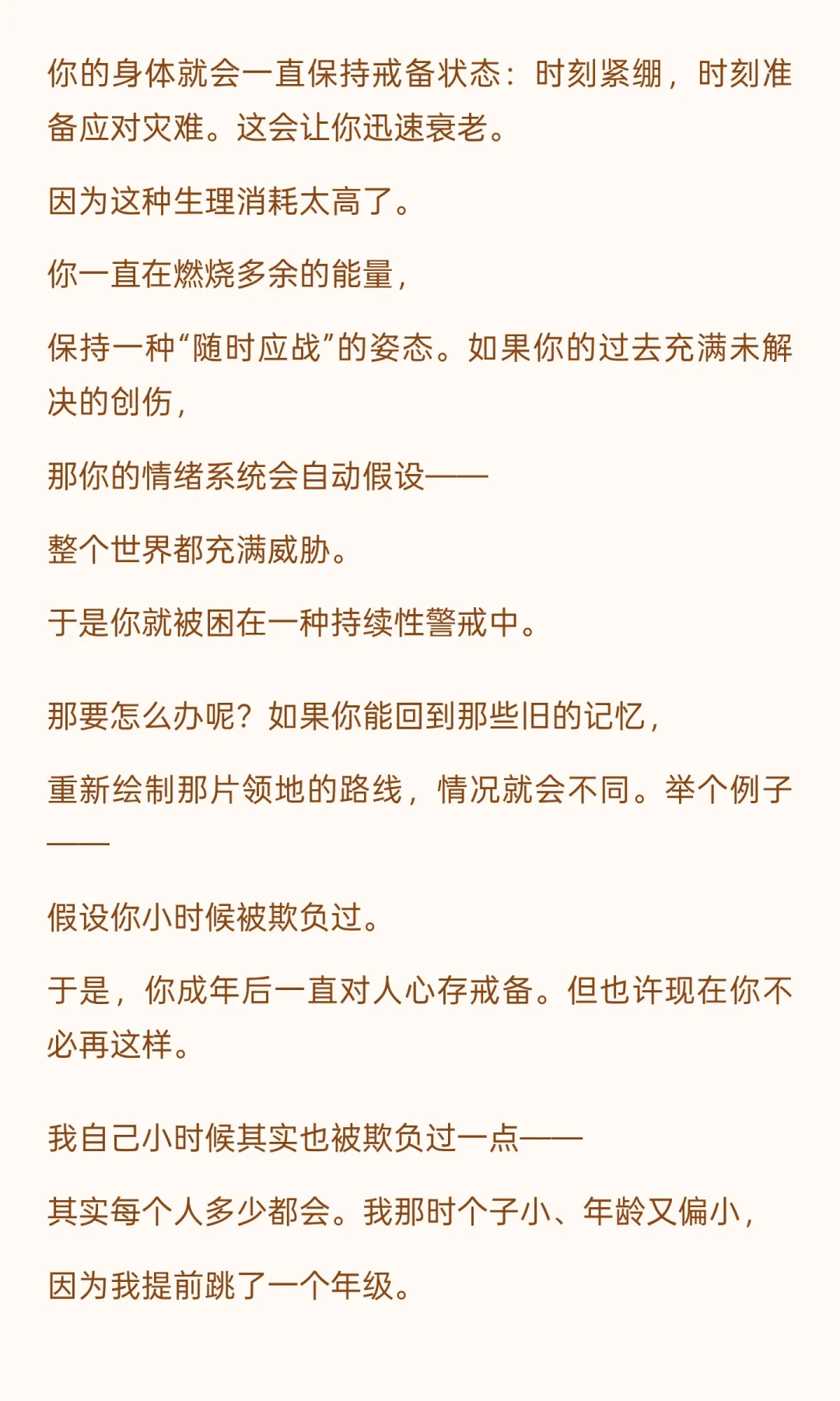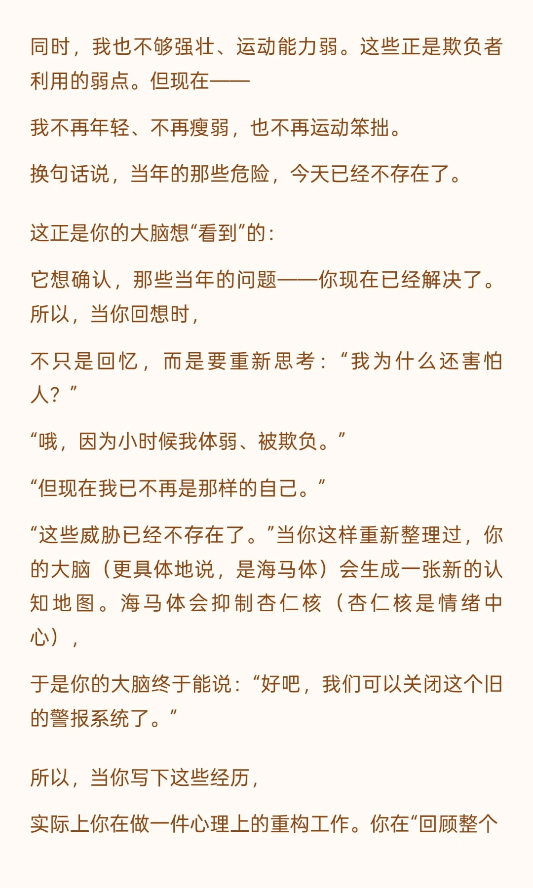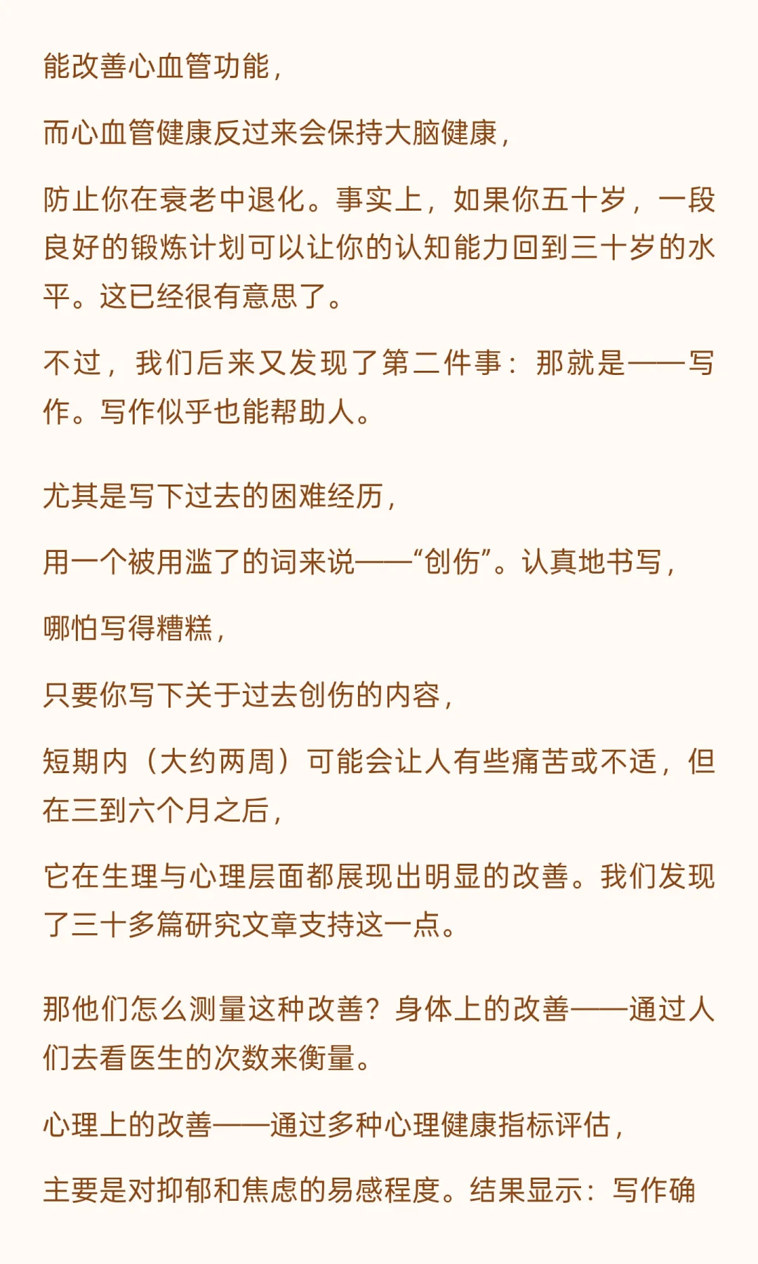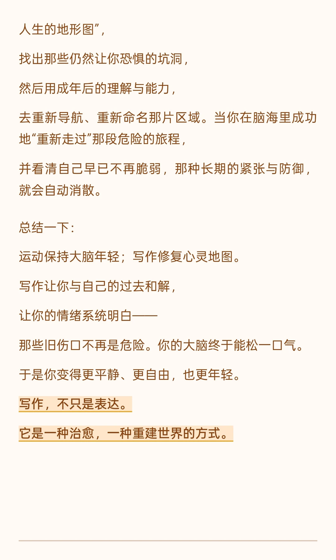 运动和写作对认知和心理健康至关重要。 有氧运动改善心血管健康,防止认知衰退; 写作,尤其是回顾创伤经历,能缓解长期情绪压力,重建心理地图,让人更平静和年轻。 总结一下:运动保持大脑年轻;写作修复心灵地图。写作让你与自己的过去和解, 让你的情绪系统明白—— 那些旧伤口不再是危险。你的大脑终于能松一口气。 于是你变得更平静、更自由,也更年轻。写作,不只是表达。 它是一种治愈,一种重建世界的方式。