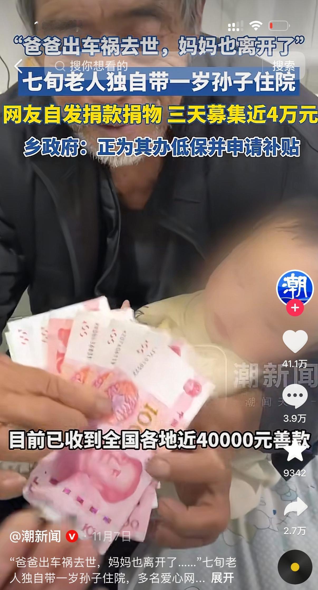 破防了!昆明74岁爷爷带1岁孙子住院,看完这幕谁能不心疼! 孩子爸车祸离世,妈妈一去不返,74岁的爷爷独自扛起一切。背着患肺炎的孙子走三里山路求医,500块押金交完就见底,自己啃馒头配咸菜,孩子连件厚衣服都没有。 还好同病房的周女士暖心出手,拍视频求助后,爱心瞬间刷屏。网友们你50我200,48小时凑了近3万善款,还有人寄来衣服奶粉,连政府都上门办了低保和专项补贴。 这世上最动人的从不是惊天壮举,而是陌生人攒起来的细碎温暖。善意不分大小,却能照亮祖孙俩的绝境。你被这份爱心接力打动了吗?来评论区为善良的人们点个赞~